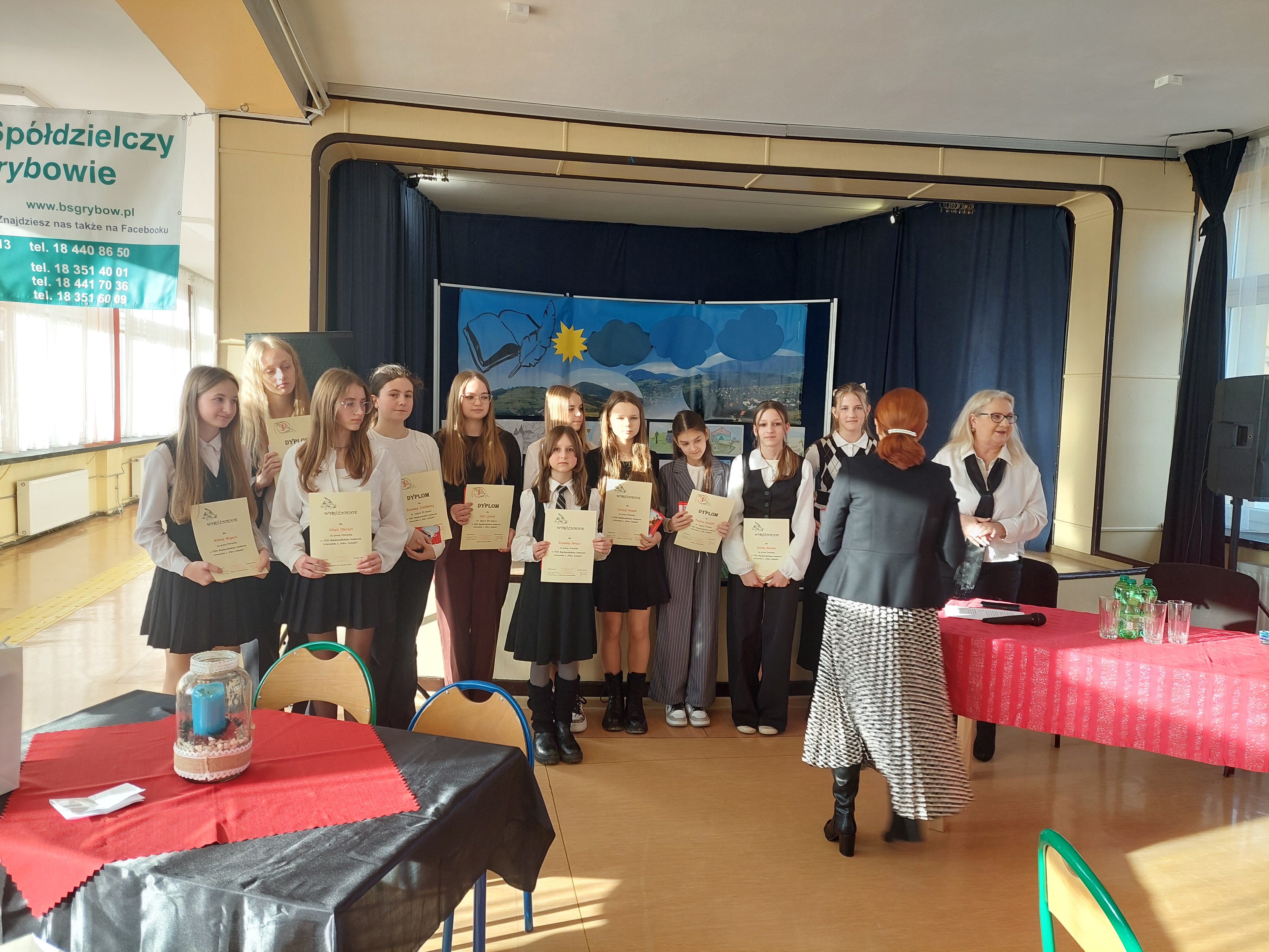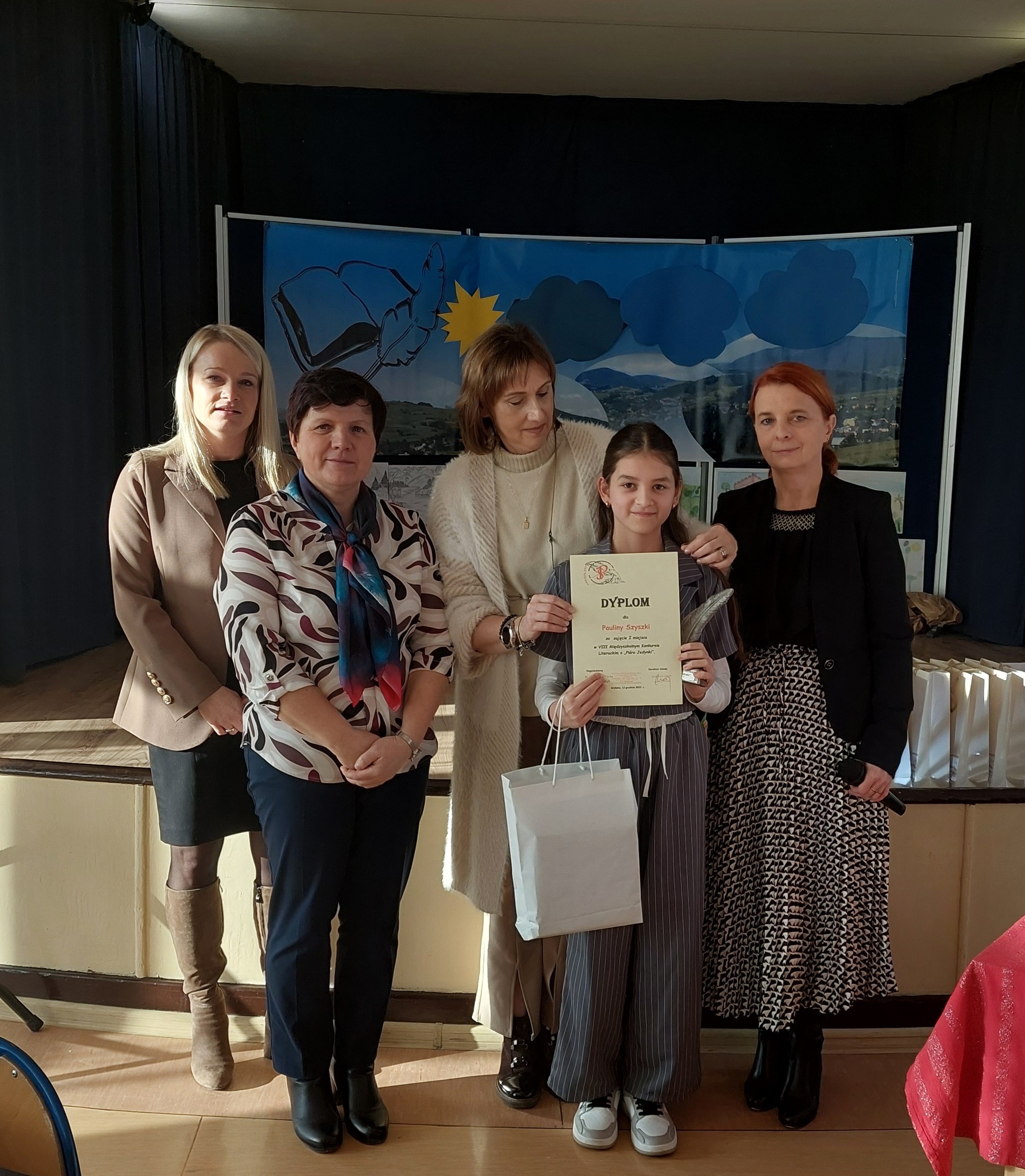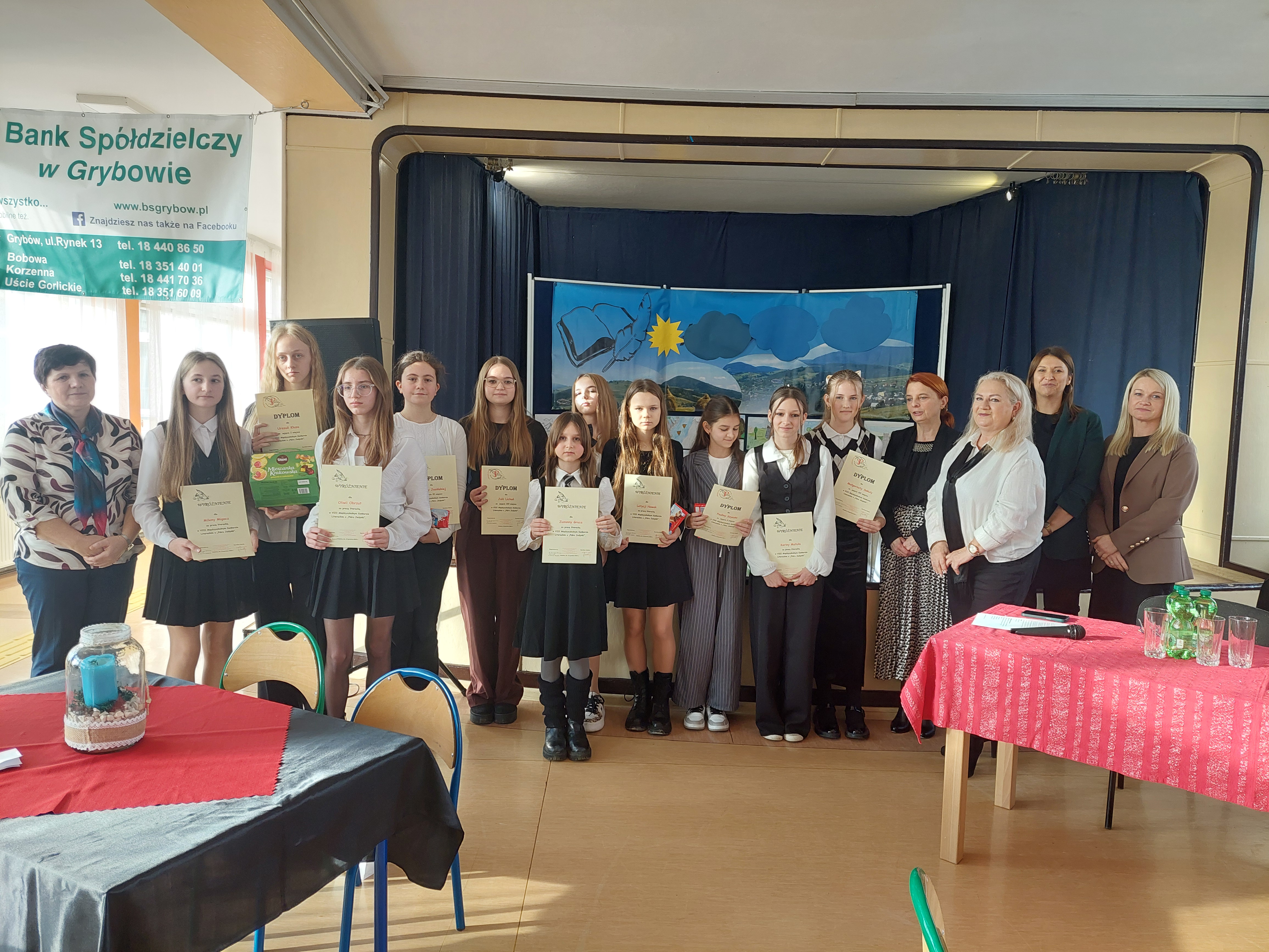 Uczniowie naszej szkoły wzięli udział w 8 Międzyszkolnym Konkursie Literackim "Pióro jedynki" organizowanym przez Szkołę Podstawową nr 1 w Grybowie. Udział wzięło 7 osób z kl. 8a, 6a, 6b. Uczniowie pisali pracę w dwóch kategoriach: junior kl. 4 - 6 oraz senior kl. 7 - 8. W kategorii junior uczniowie mieli napisać wersję współczesnego mitu, natomiast w kategorii senior - przemówienie. Temat przewodni konkursu brzmiał: "Przyroda naszym bogactwem". Finał konkursu odbył się 12 grudnia 2025 r. Podopieczni pani Anety Cygnarowicz - Aleksander oraz pani Elżbiety Stadnik napisali piekne prace. Wszyscy uczestnicy zdobyli nagrody. W kategorii junior Paulina Szyszka z kl. 6a zdobyla I miejsce i otrzymała "Pióro jedynki". Małgorzata Sekuła, Zuzanna Gruca i Karina Matuła otrzymały wyróżnienia. Gabriela Pękala oraz Letycja Nowak z kl. 8a otrzymały wyrożnienia w kategorii senior, natomiast Joanna Zielińska, też z klasy 8a, zajęła II miejsce. Uczniom ogromnie gratulujemy i życzymy dalszych sukcesów.