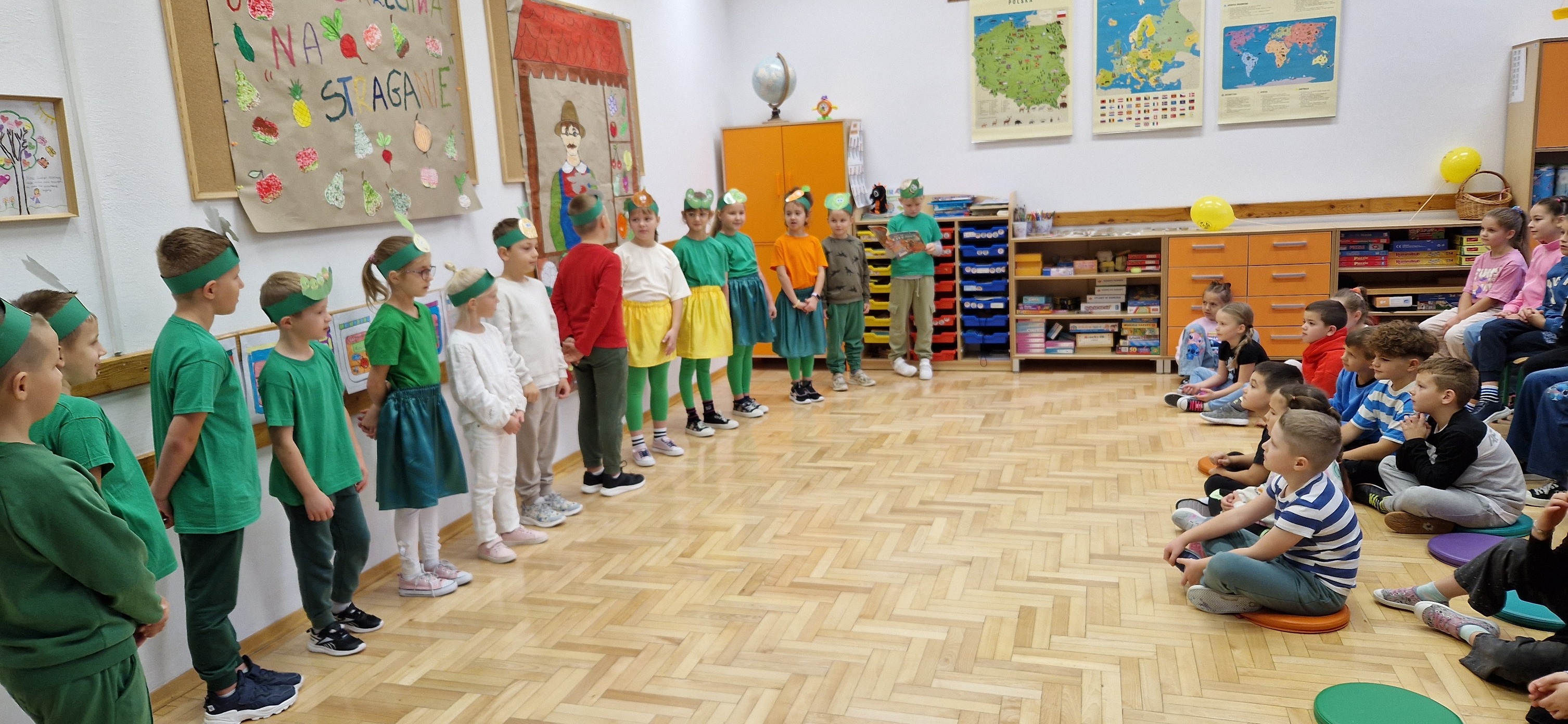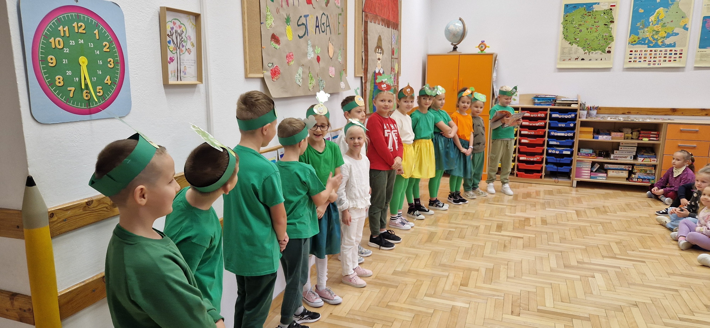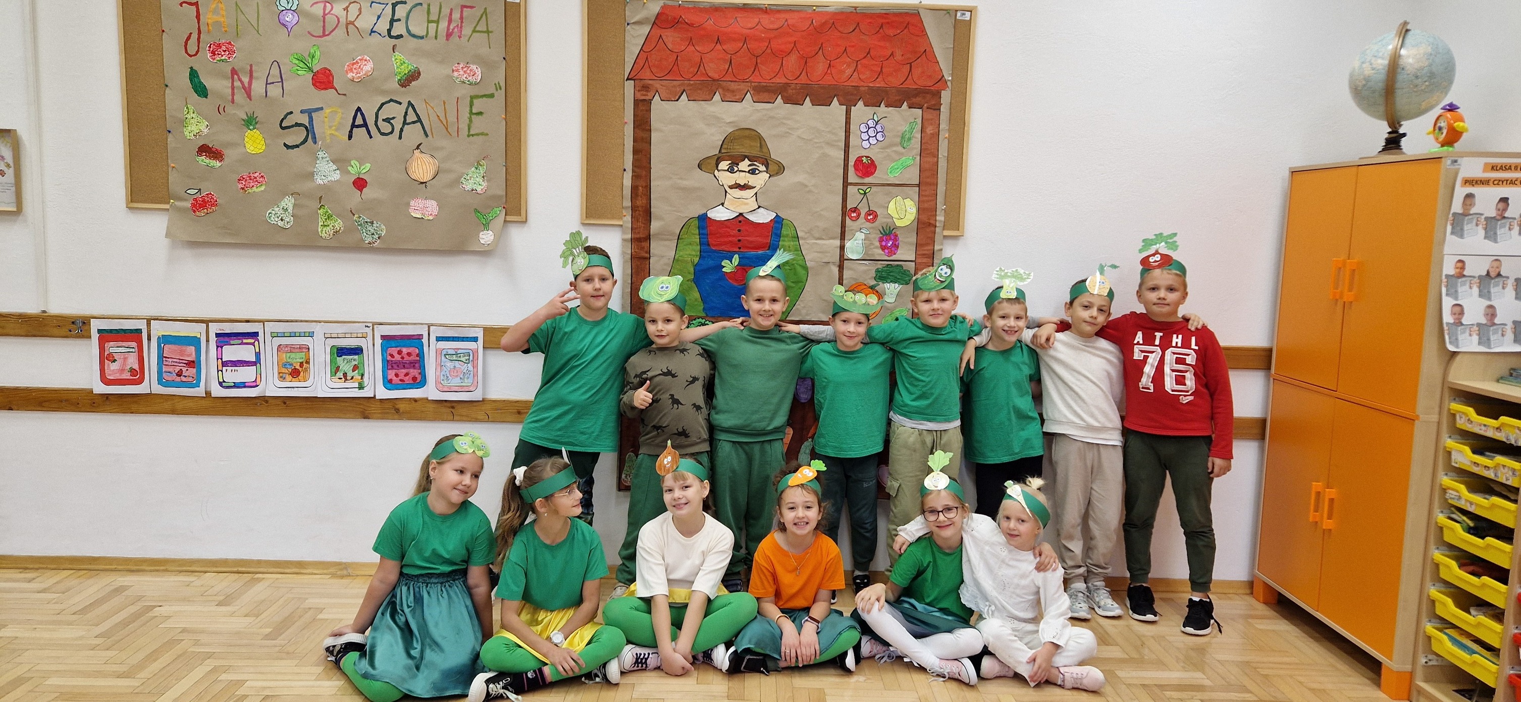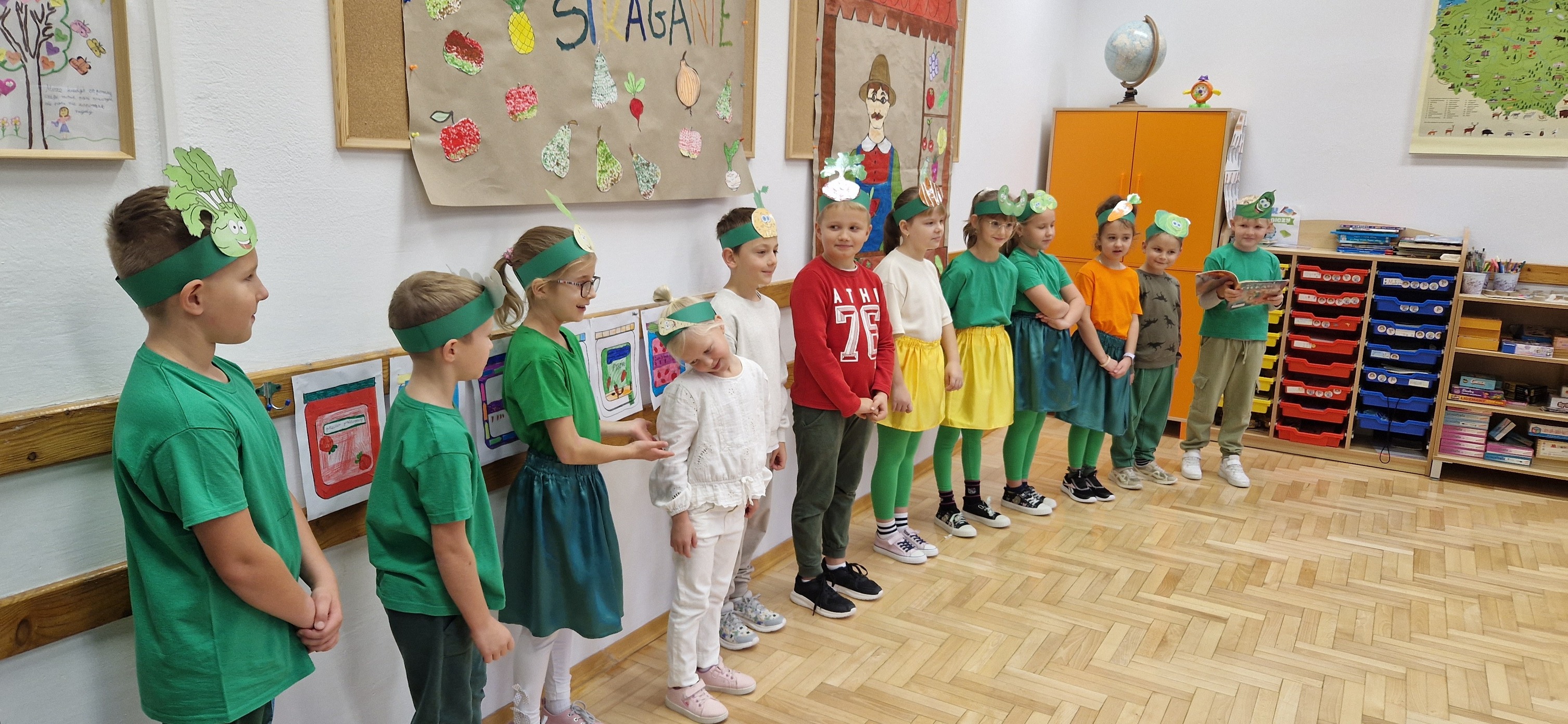 W miniony piątek mali aktorzy z klasy 2b wystąpili dla swoich kolegów i koleżanek z klas 0 - 3 w inscenizacji wiersza Jana Brzechwy: "Na straganie". Dzieci nie tylko wcieliły się w role warzyw - bohaterów wiersza, ale także, z pomocą pani Anny Witek, wykonały dekorację do swojego występu. Drugoklasiści, pomimo małej tremy, pięknie się zaprezentowali, o czym świadczyła radość i brawa, które otrzymali od zebranej publiczności.
