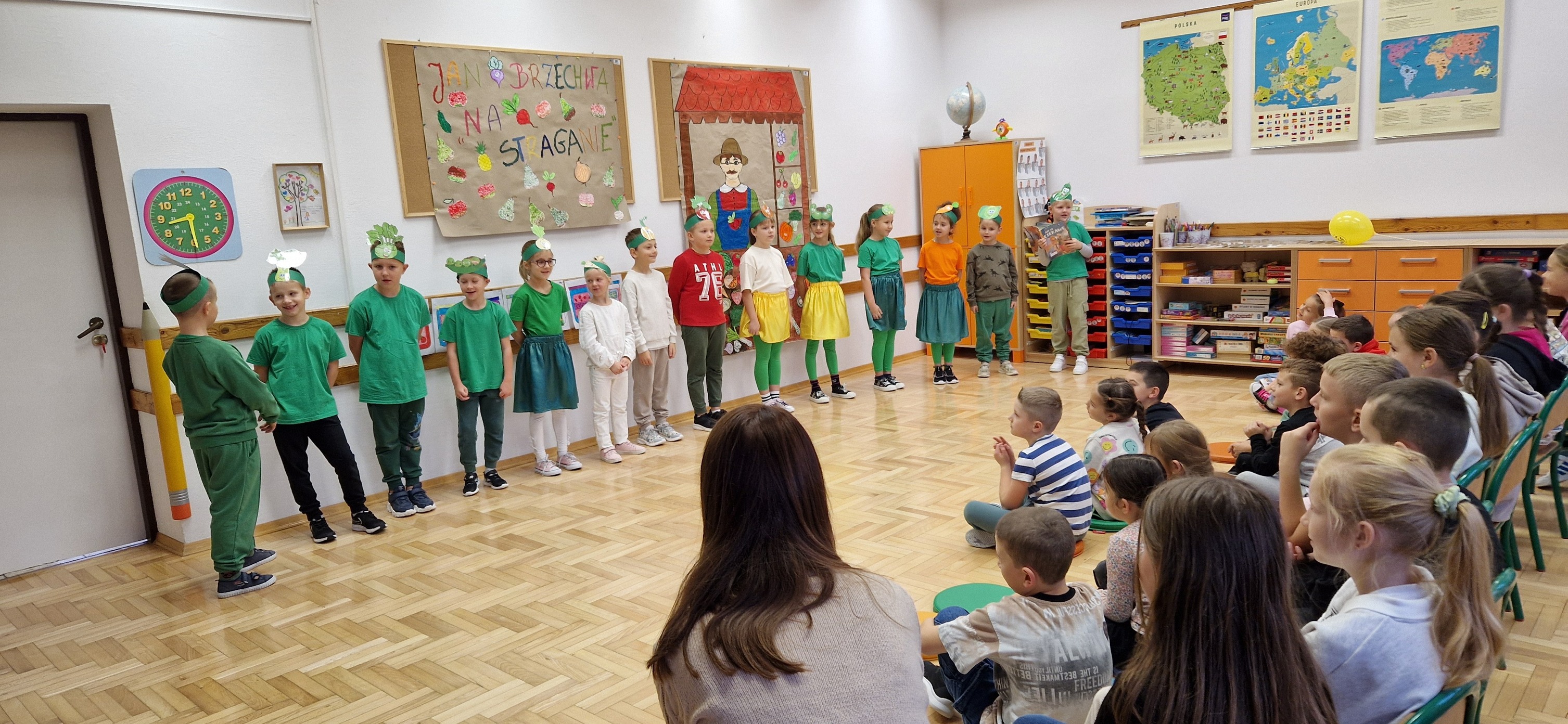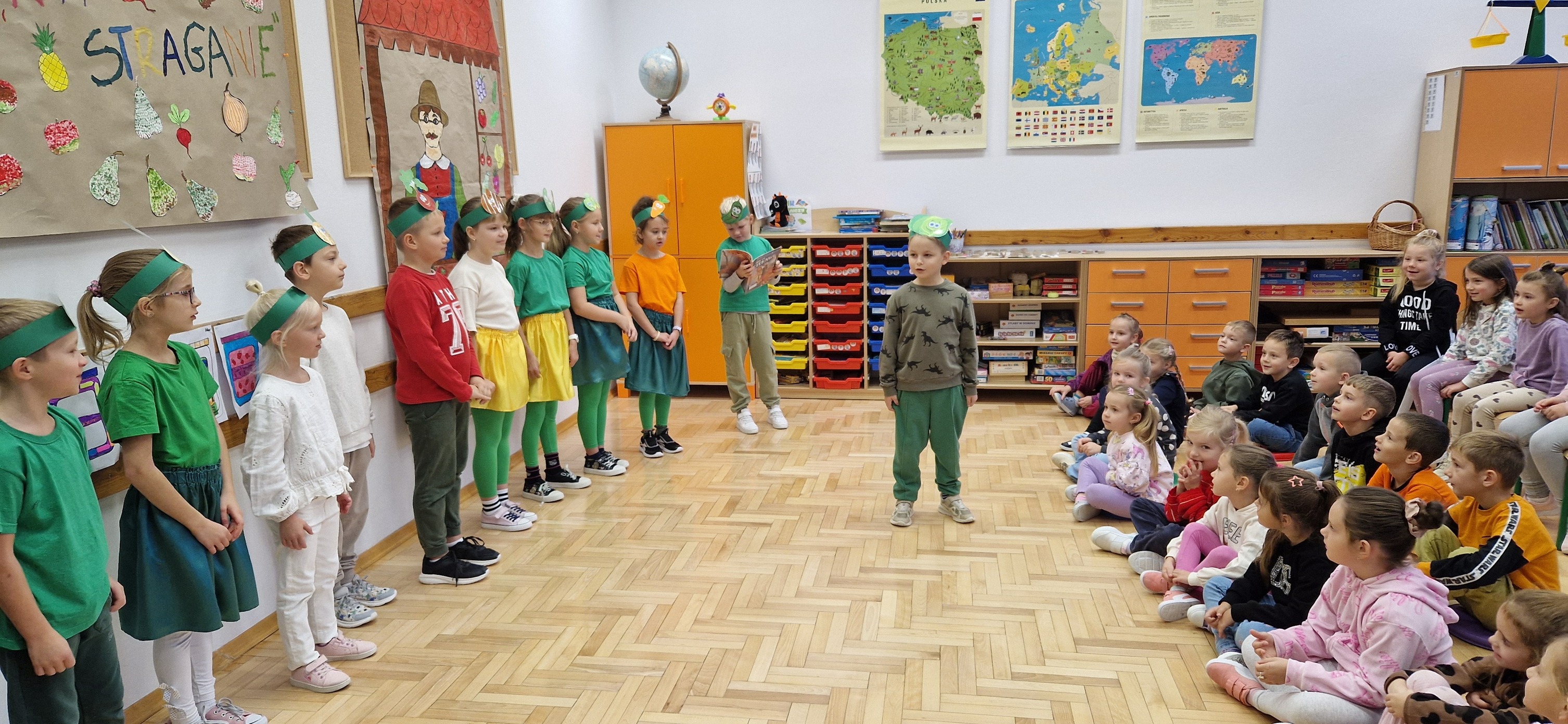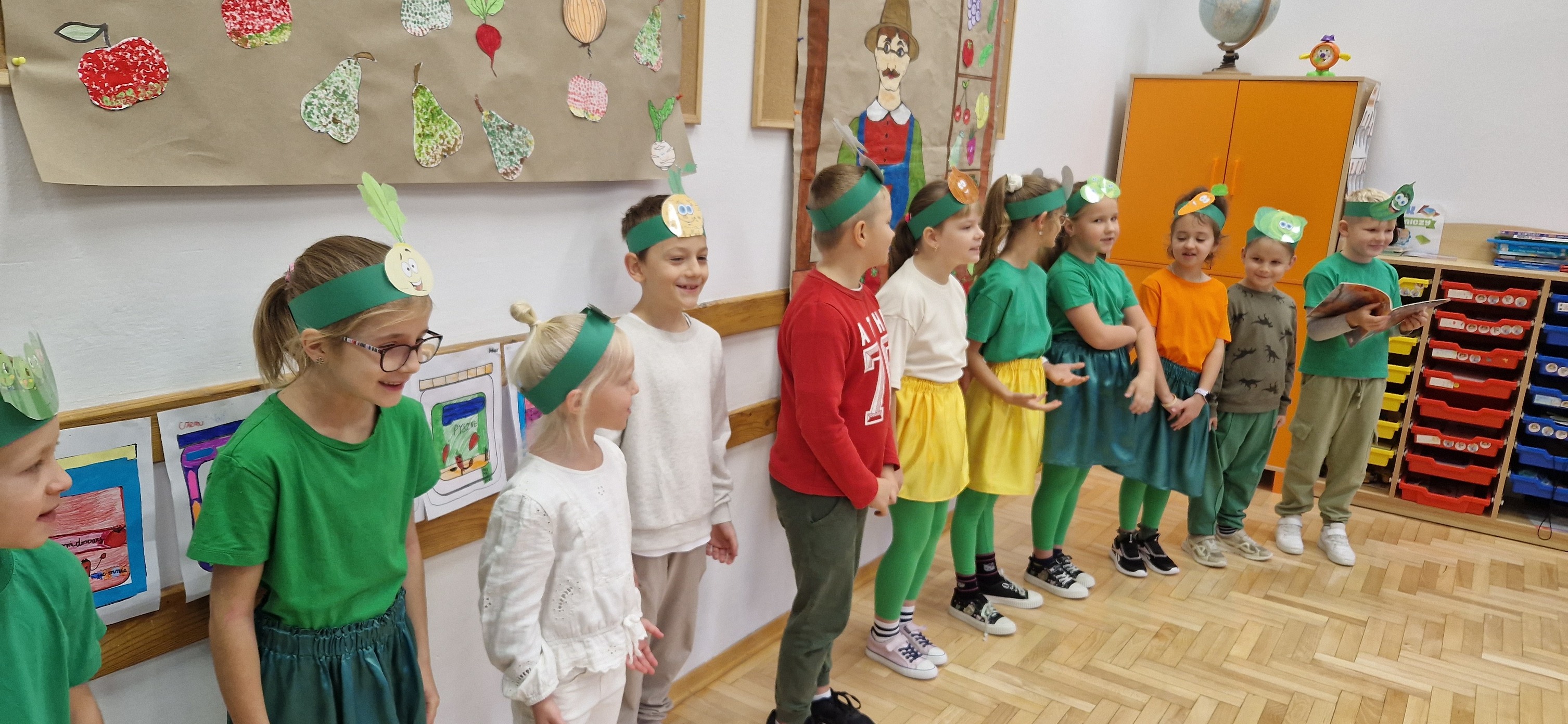 W miniony piątek mali aktorzy z klasy 2b wystąpili dla swoich kolegów i koleżanek z klas 0 - 3 w inscenizacji wiersza Jana Brzechwy: "Na straganie". Dzieci nie tylko wcieliły się w role warzyw - bohaterów wiersza, ale także, z pomocą pani Anny Witek, wykonały dekorację do swojego występu. Drugoklasiści, pomimo małej tremy, pięknie się zaprezentowali, o czym świadczyła radość i brawa, które otrzymali od zebranej publiczności.