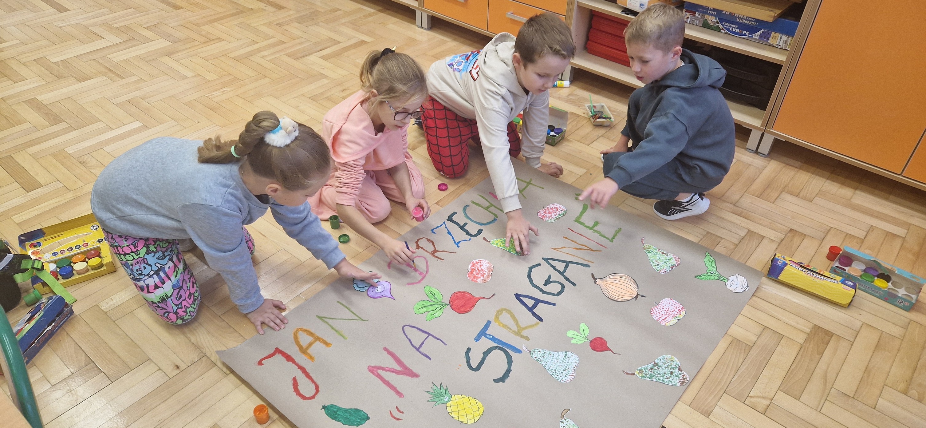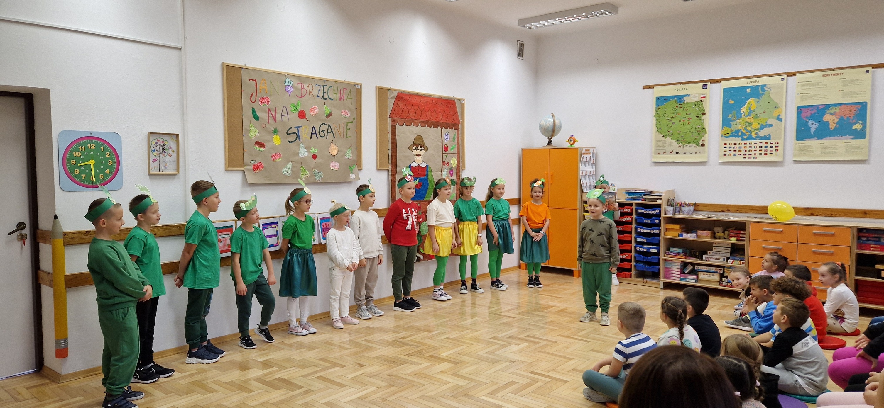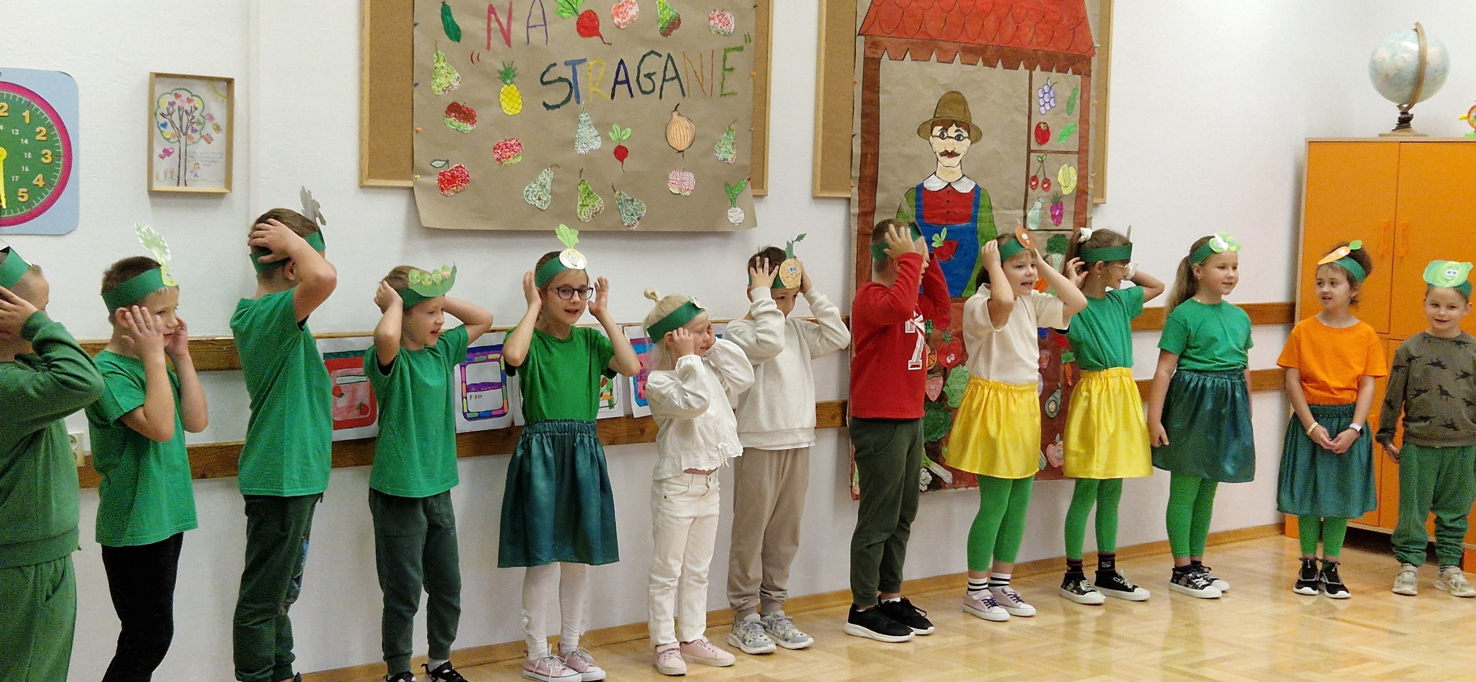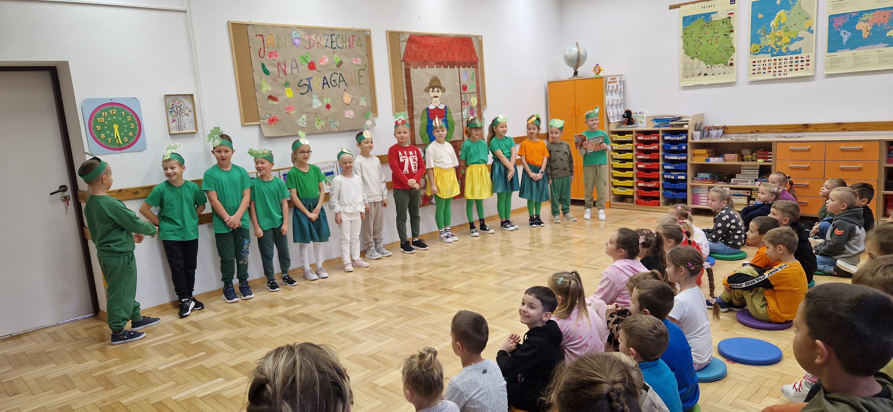 W miniony piątek mali aktorzy z klasy 2b wystąpili dla swoich kolegów i koleżanek z klas 0 - 3 w inscenizacji wiersza Jana Brzechwy: "Na straganie". Dzieci nie tylko wcieliły się w role warzyw - bohaterów wiersza, ale także, z pomocą pani Anny Witek, wykonały dekorację do swojego występu. Drugoklasiści, pomimo małej tremy, pięknie się zaprezentowali, o czym świadczyła radość i brawa, które otrzymali od zebranej publiczności.