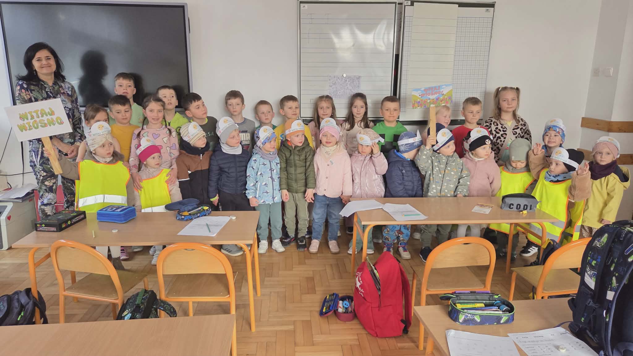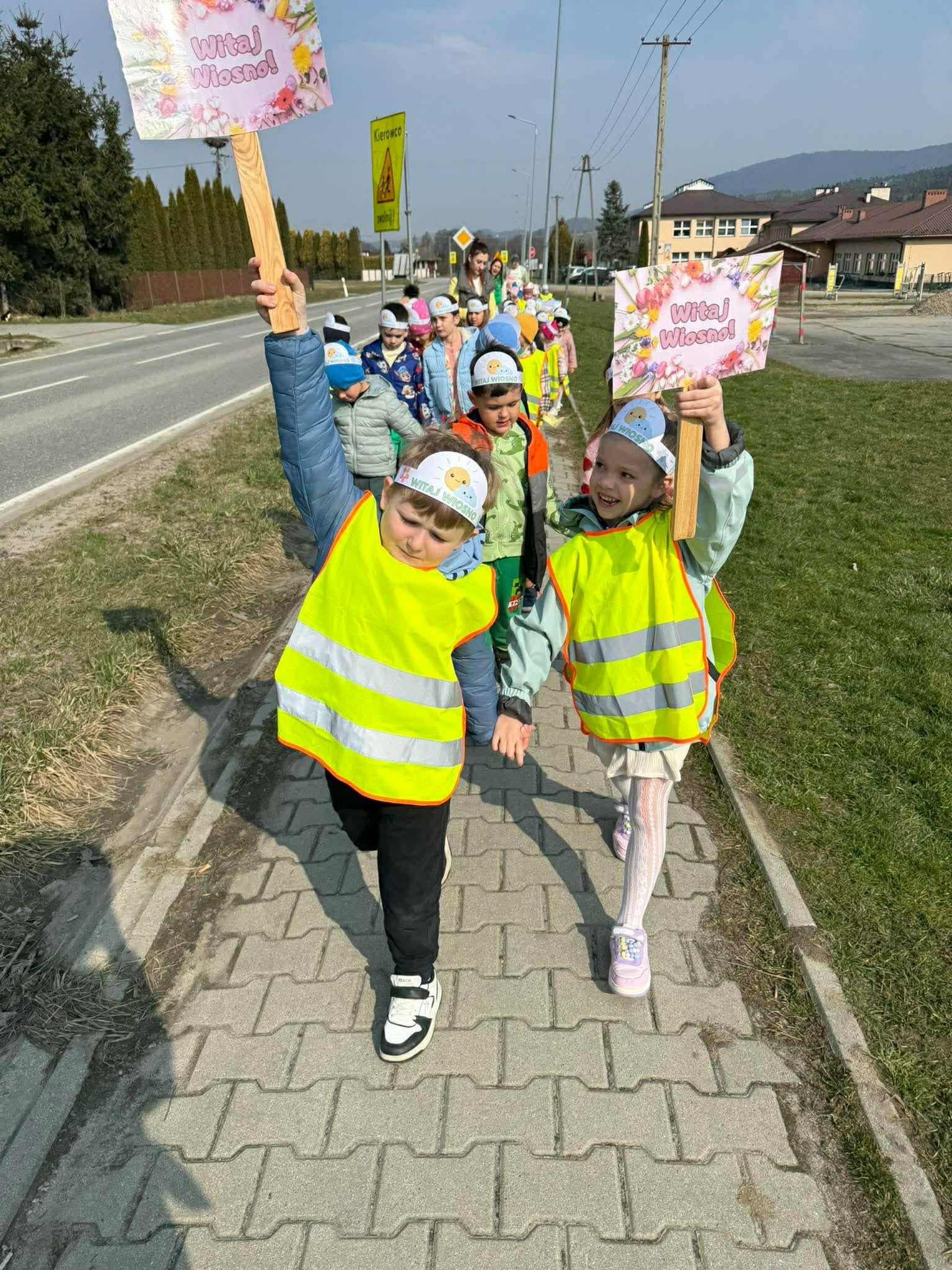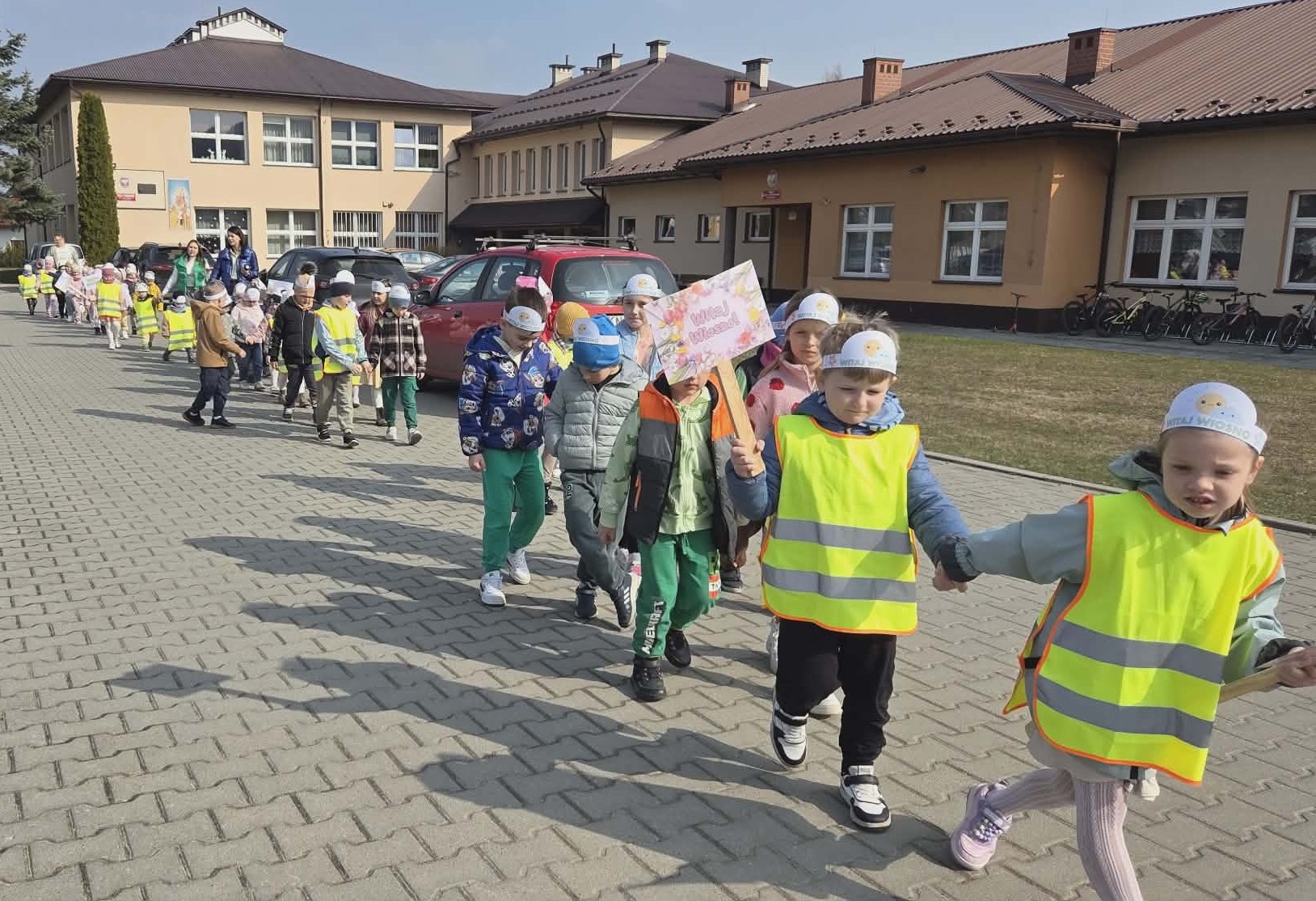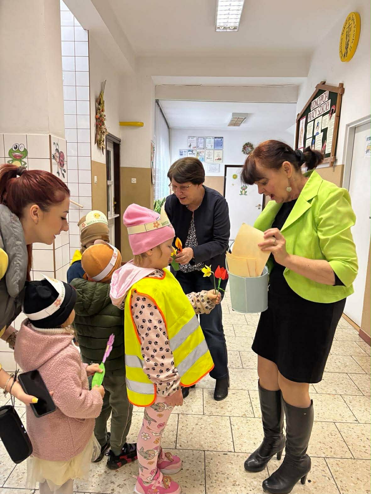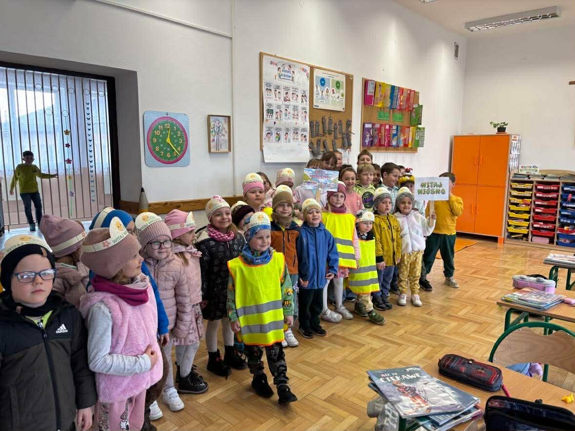 Dzieci z grup „Zuchy”, „Łowcy Przygód” oraz „Odkrywcy” wyruszyły w wiosennym pochodzie, by wspólnie powitać pierwszy dzień wiosny. Ubrane w barwne stroje, z kwiatami w dłoniach i transparentami, z uśmiechem na twarzach przemierzały przedszkolne i szkolne korytarze. W trakcie pochodu dzieci odwiedziły Dyrekcję, Wychowawców oraz starsze koleżanki i kolegów ze szkoły, dzieląc się wiosenną energią. To był piękny dzień! Życzymy by każdy kolejny był równie piękny!