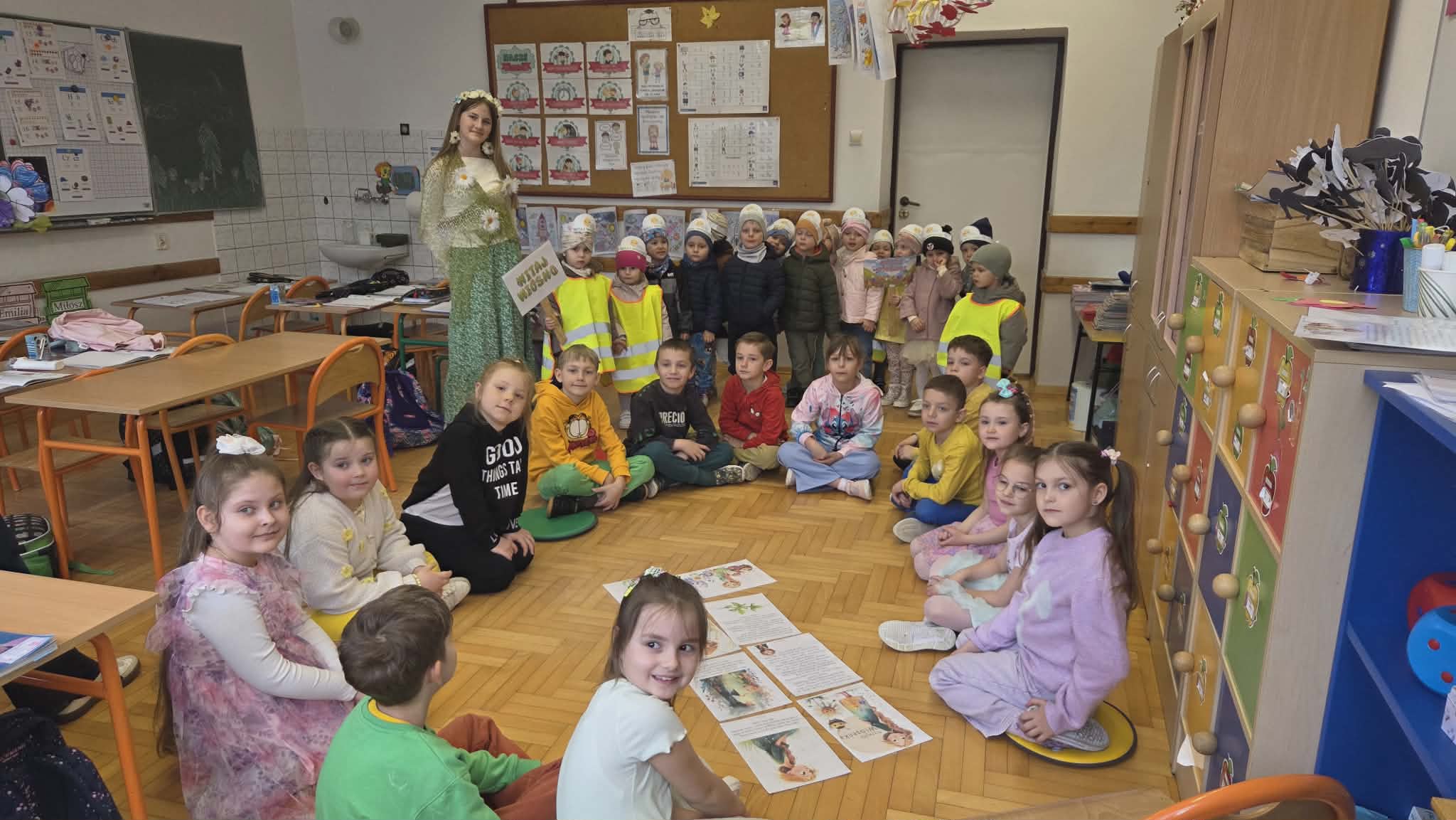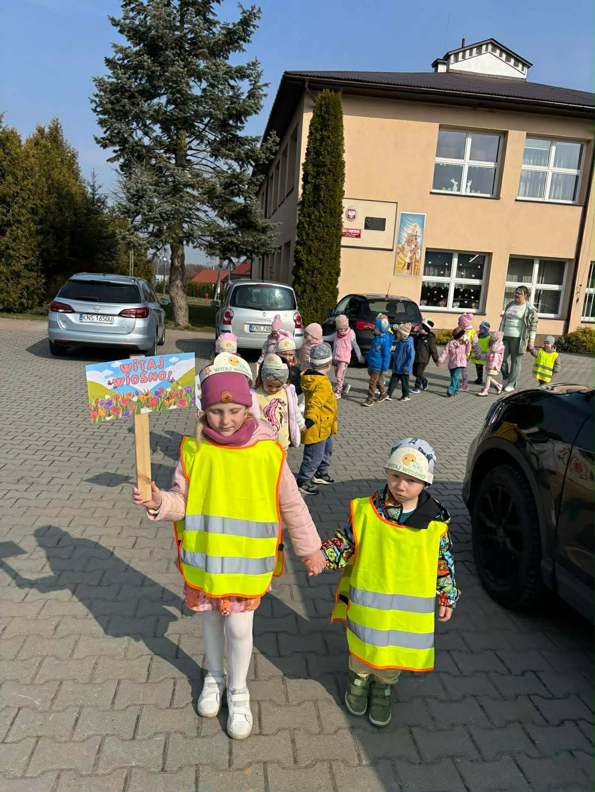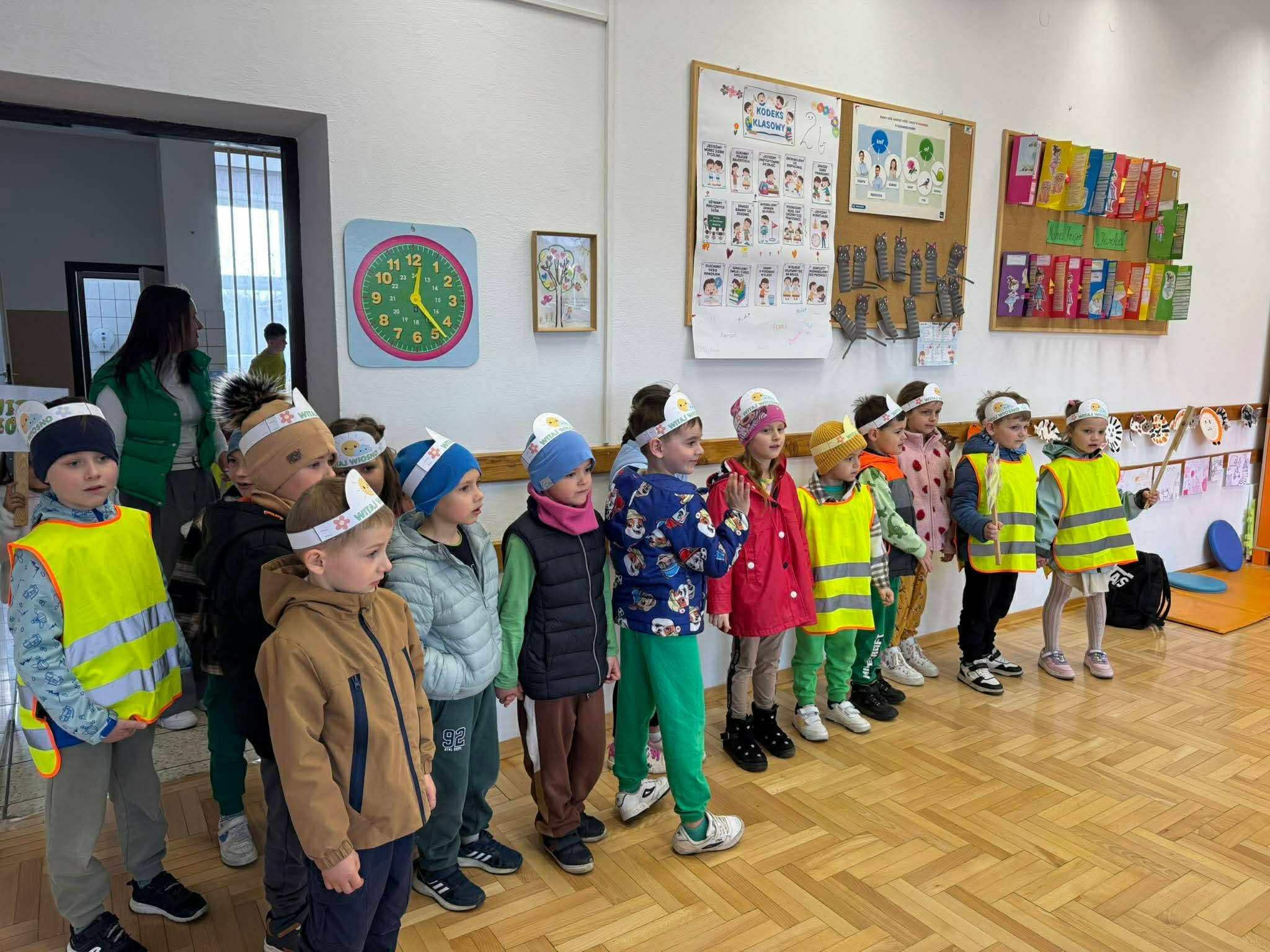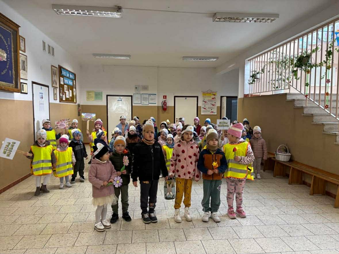 Dzieci z grup „Zuchy”, „Łowcy Przygód” oraz „Odkrywcy” wyruszyły w wiosennym pochodzie, by wspólnie powitać pierwszy dzień wiosny. Ubrane w barwne stroje, z kwiatami w dłoniach i transparentami, z uśmiechem na twarzach przemierzały przedszkolne i szkolne korytarze. W trakcie pochodu dzieci odwiedziły Dyrekcję, Wychowawców oraz starsze koleżanki i kolegów ze szkoły, dzieląc się wiosenną energią. To był piękny dzień! Życzymy by każdy kolejny był równie piękny!