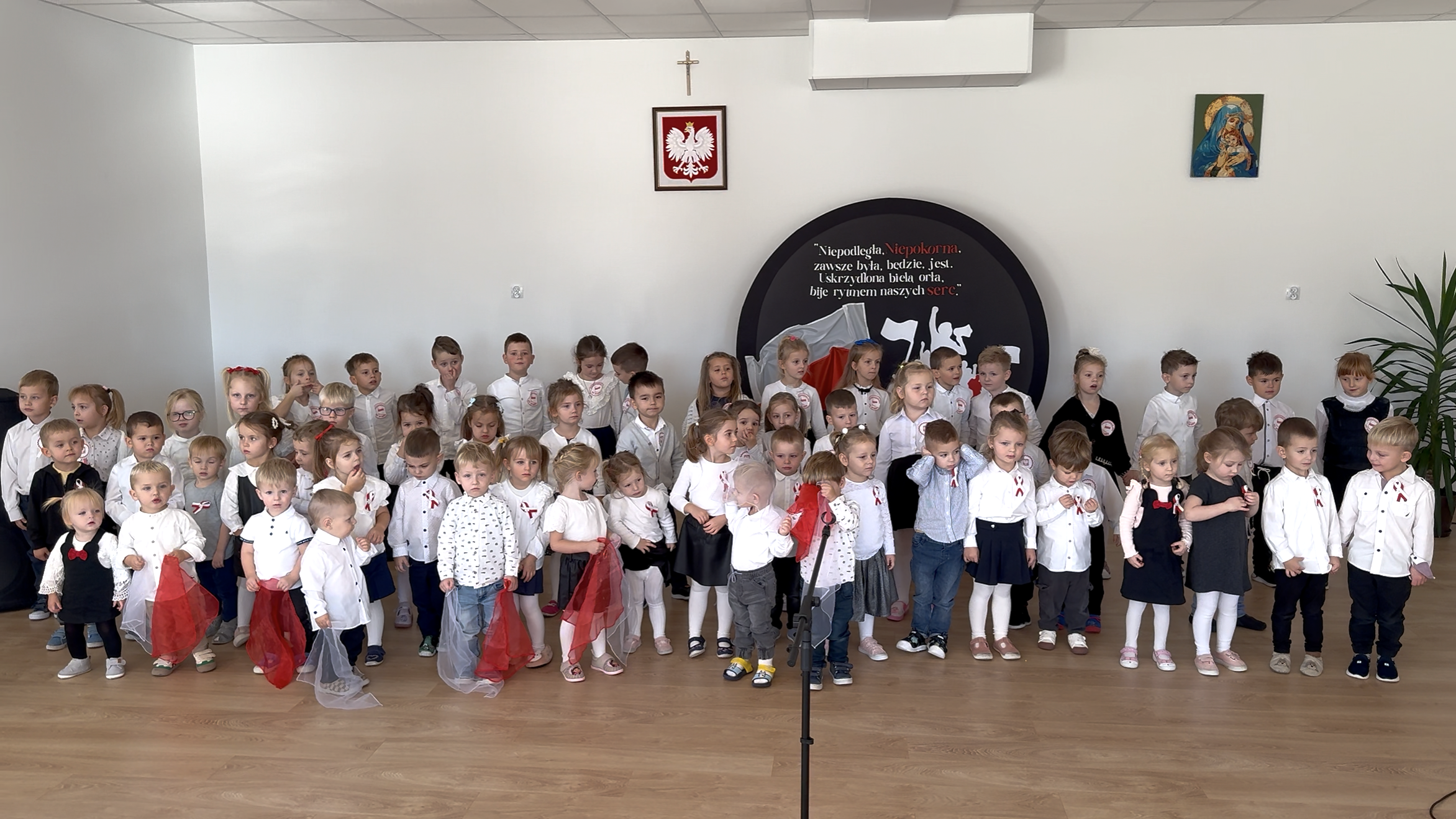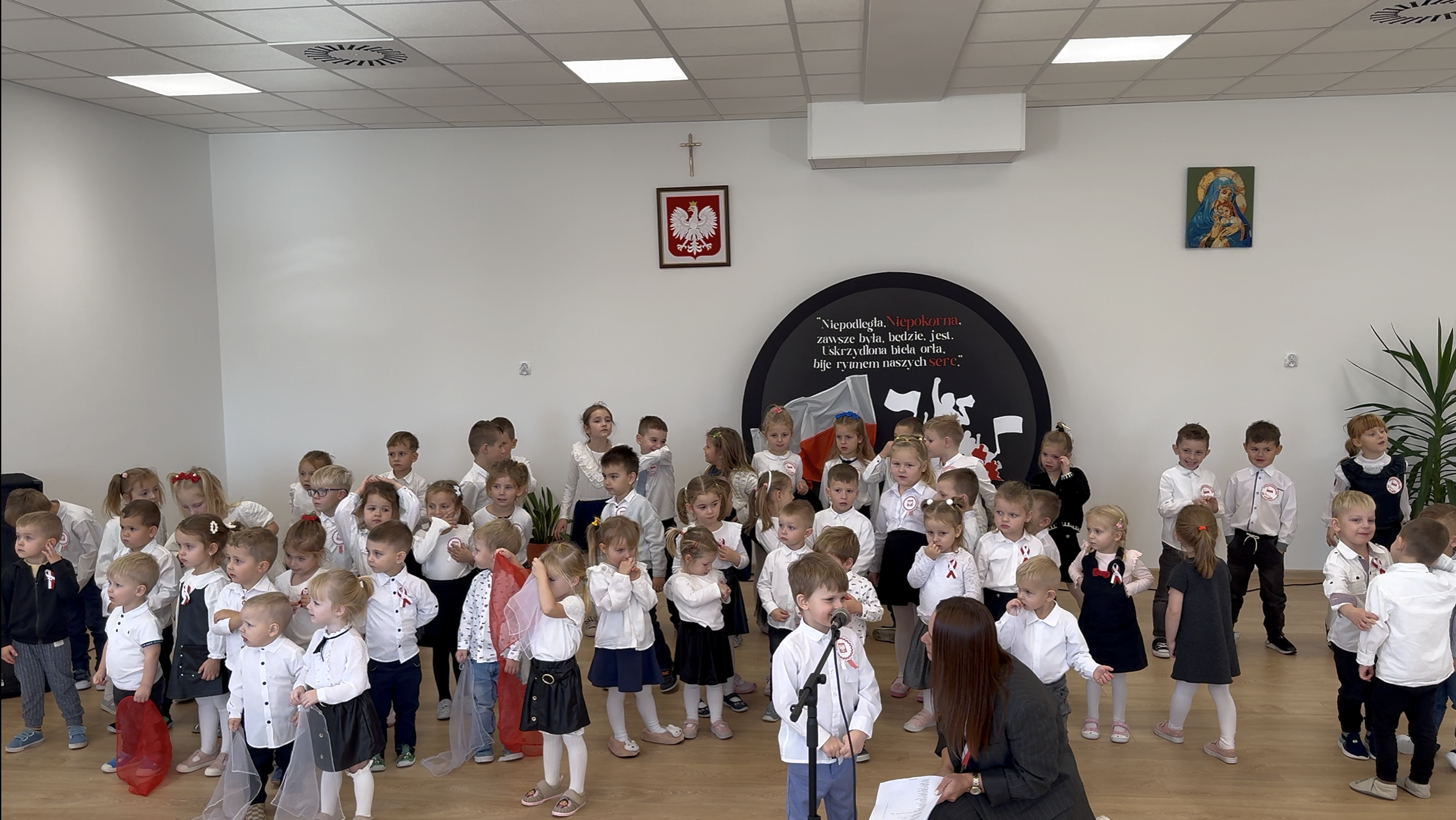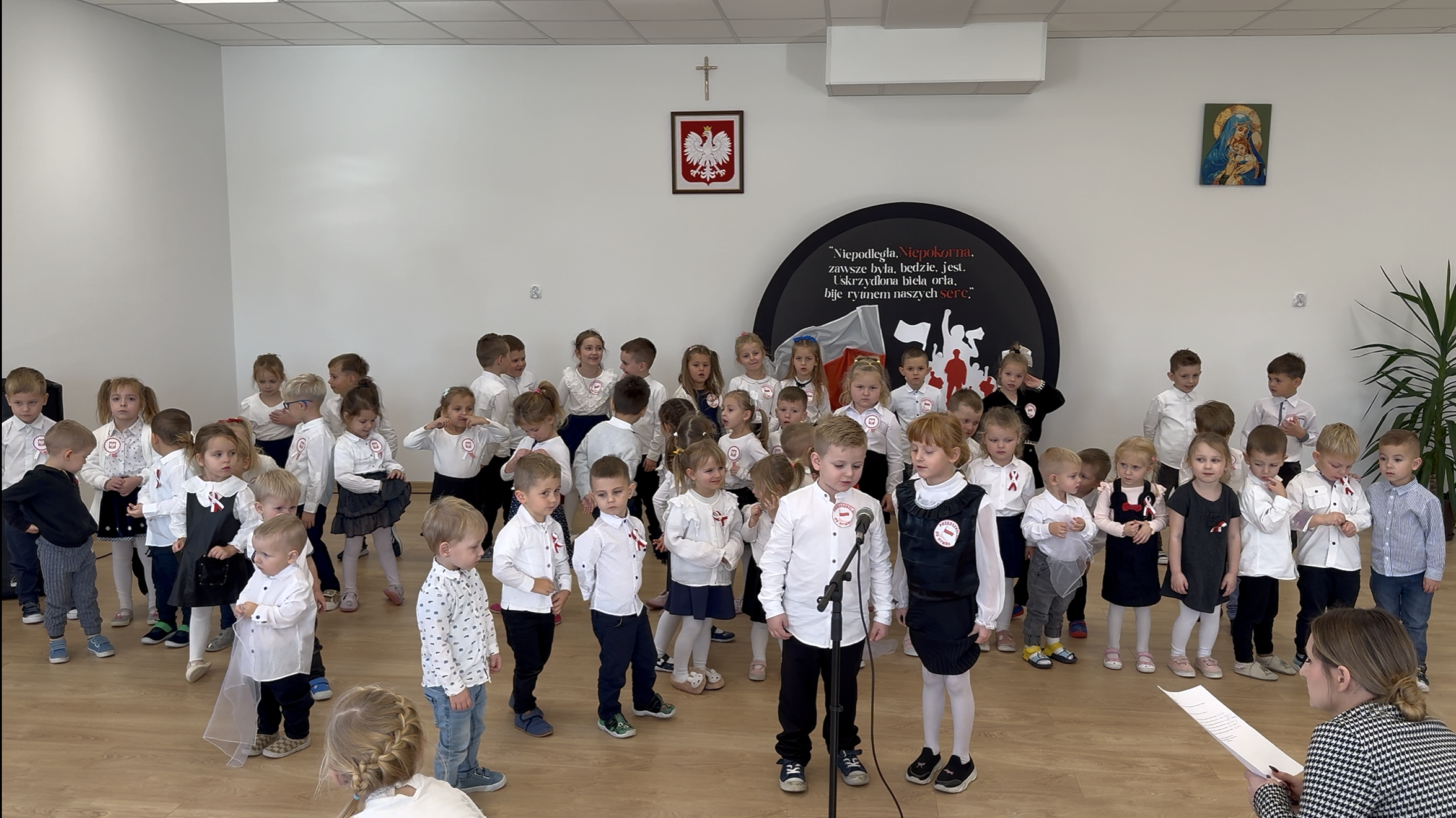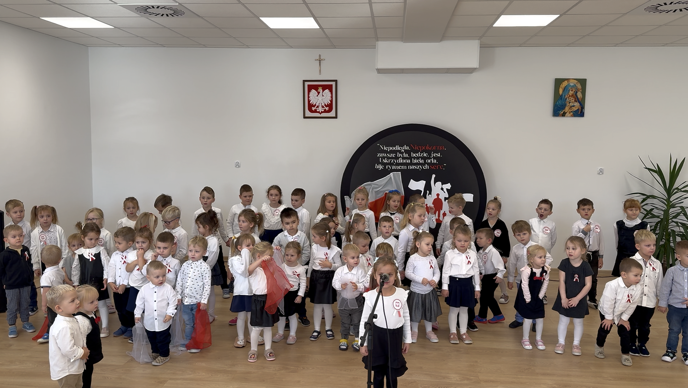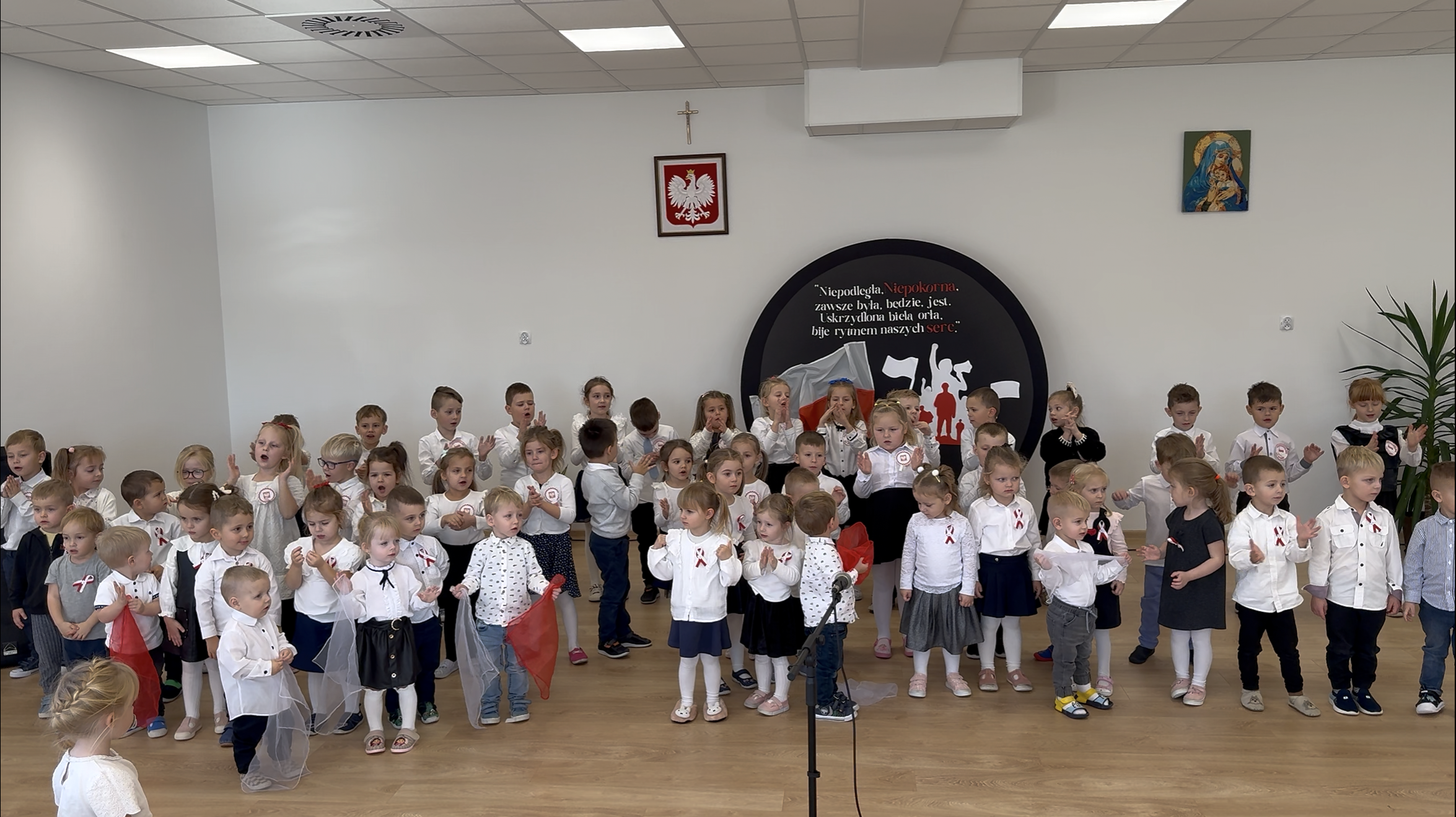 Na zakończenie, dzieci z grupy III wyrecytowały podziękowania, a cała społeczność przedszkolna zwieńczyła występ artystyczny słowami: „Dziękuję Polsko, ojczyzno moja, za to, że jesteś i ja jestem twój, twoja. Kocham cię Polsko, mocno i szczerze, bo jestem Polakiem i w Ciebie wierzę!”