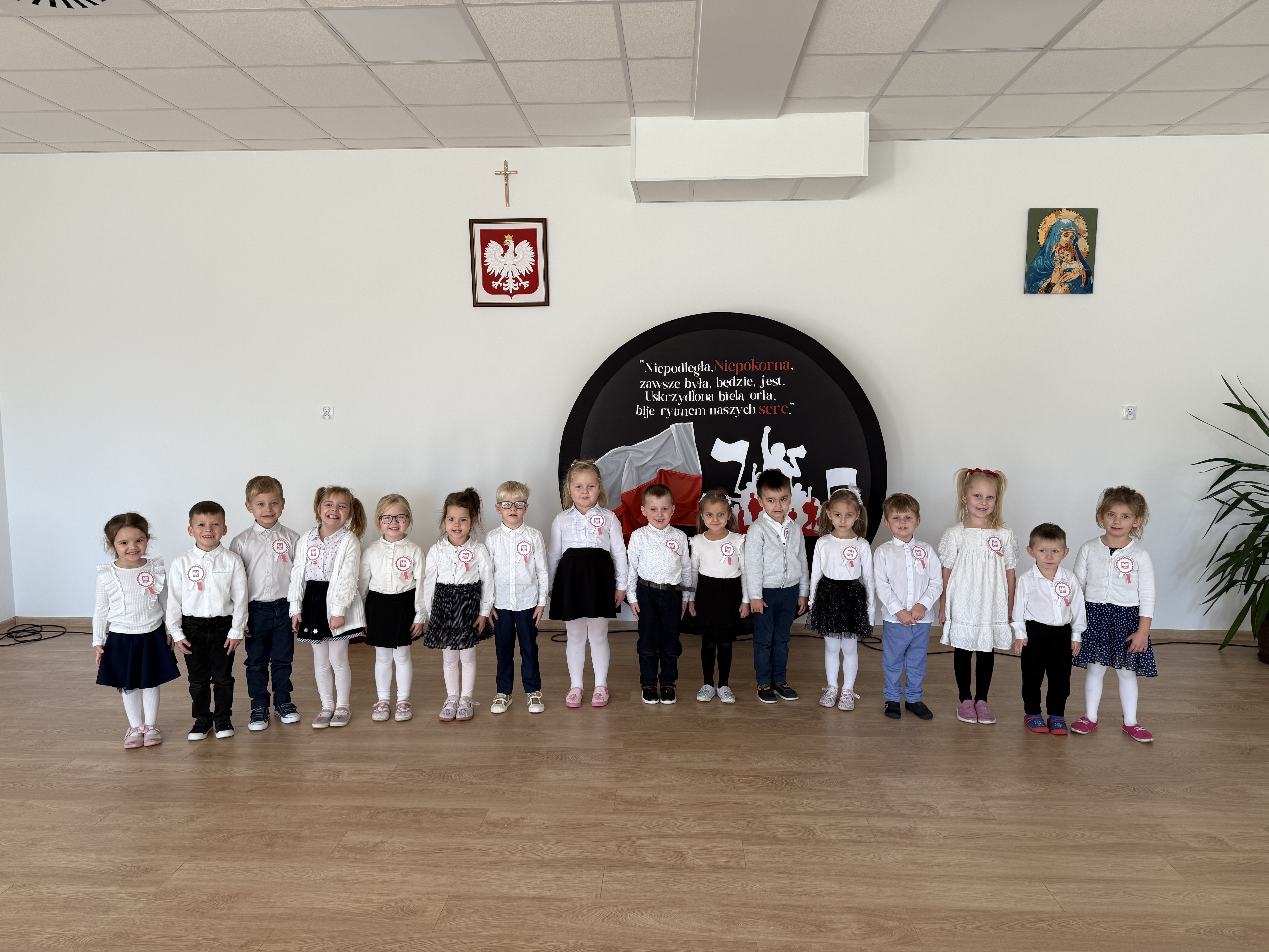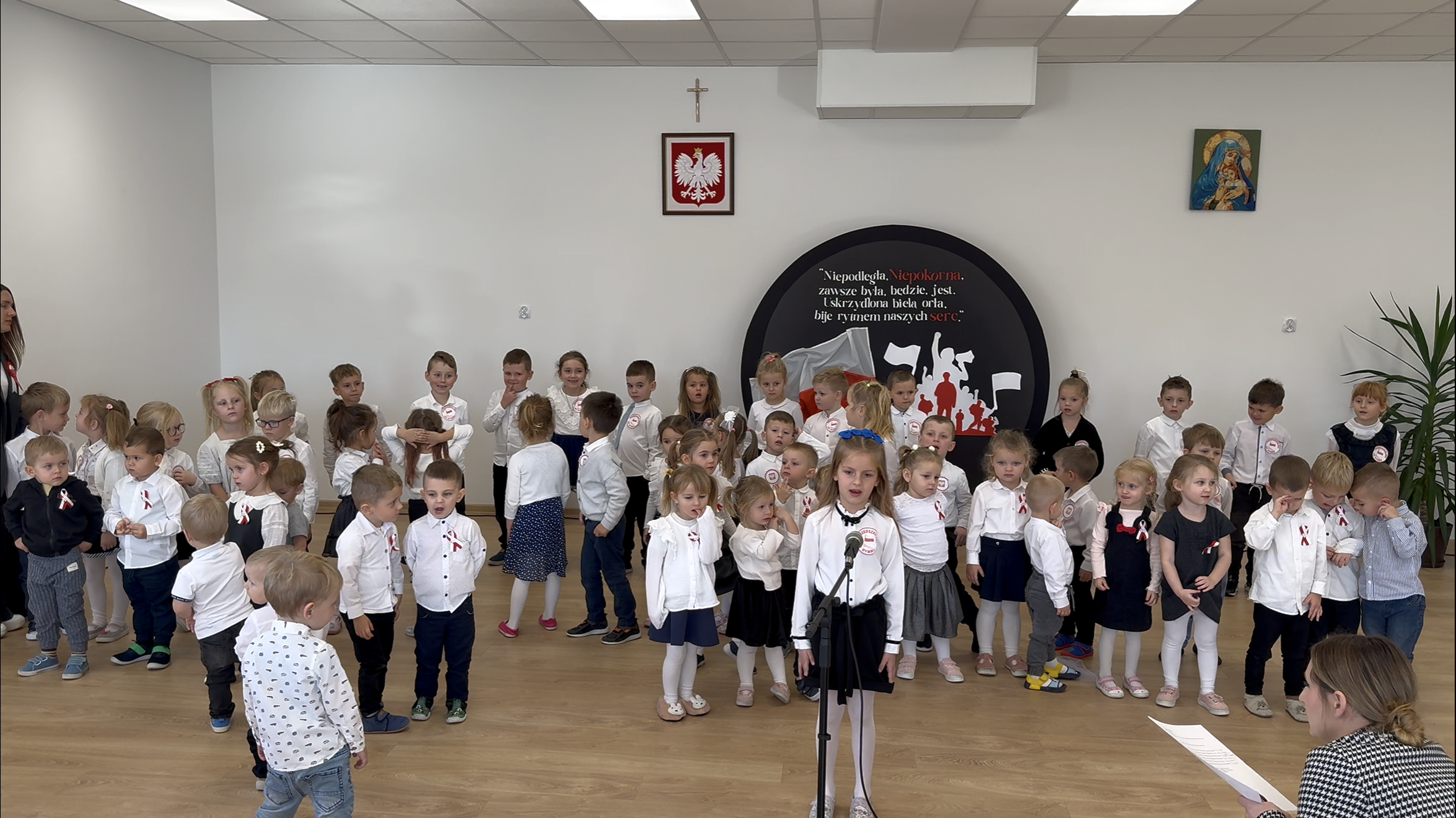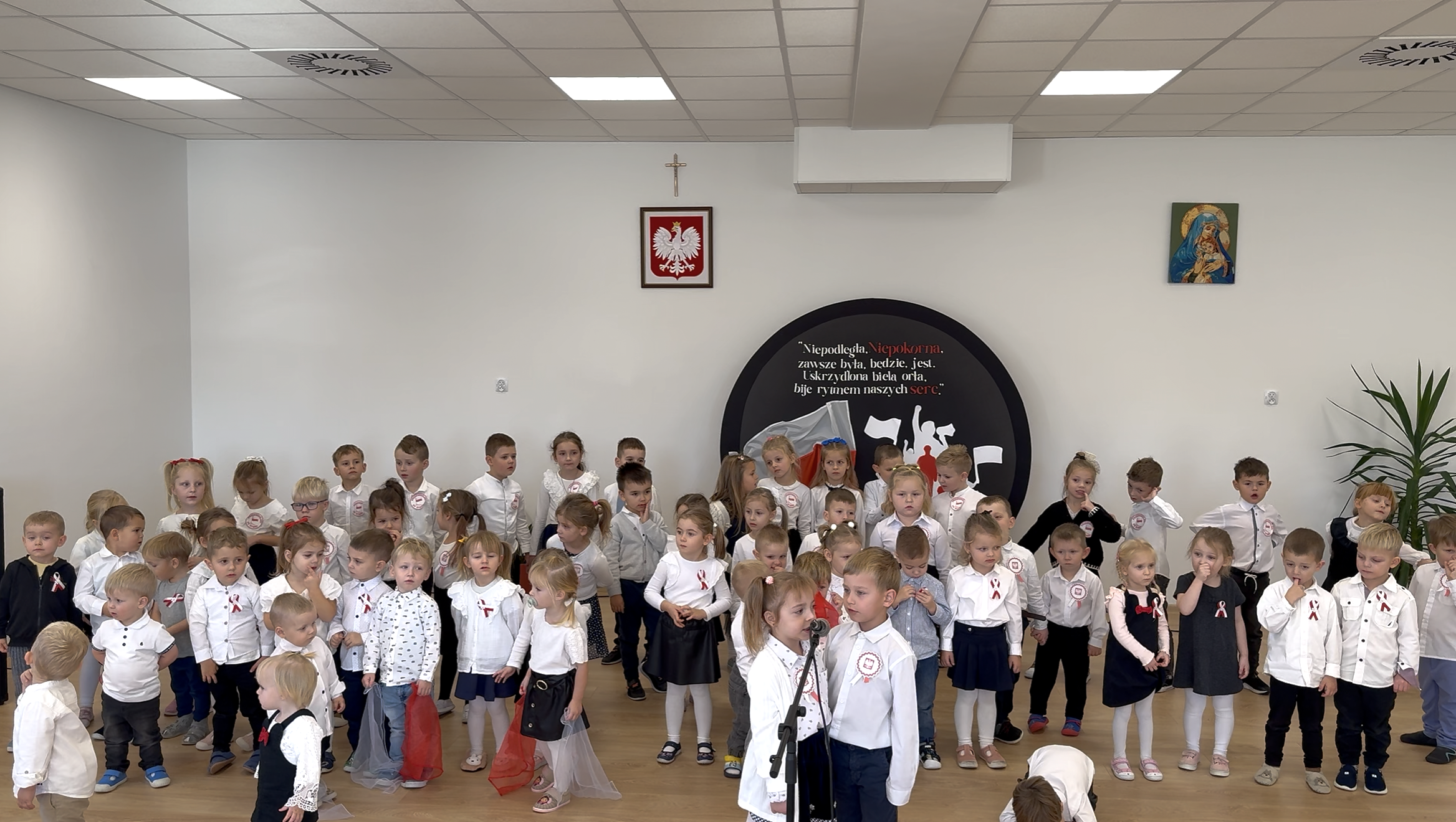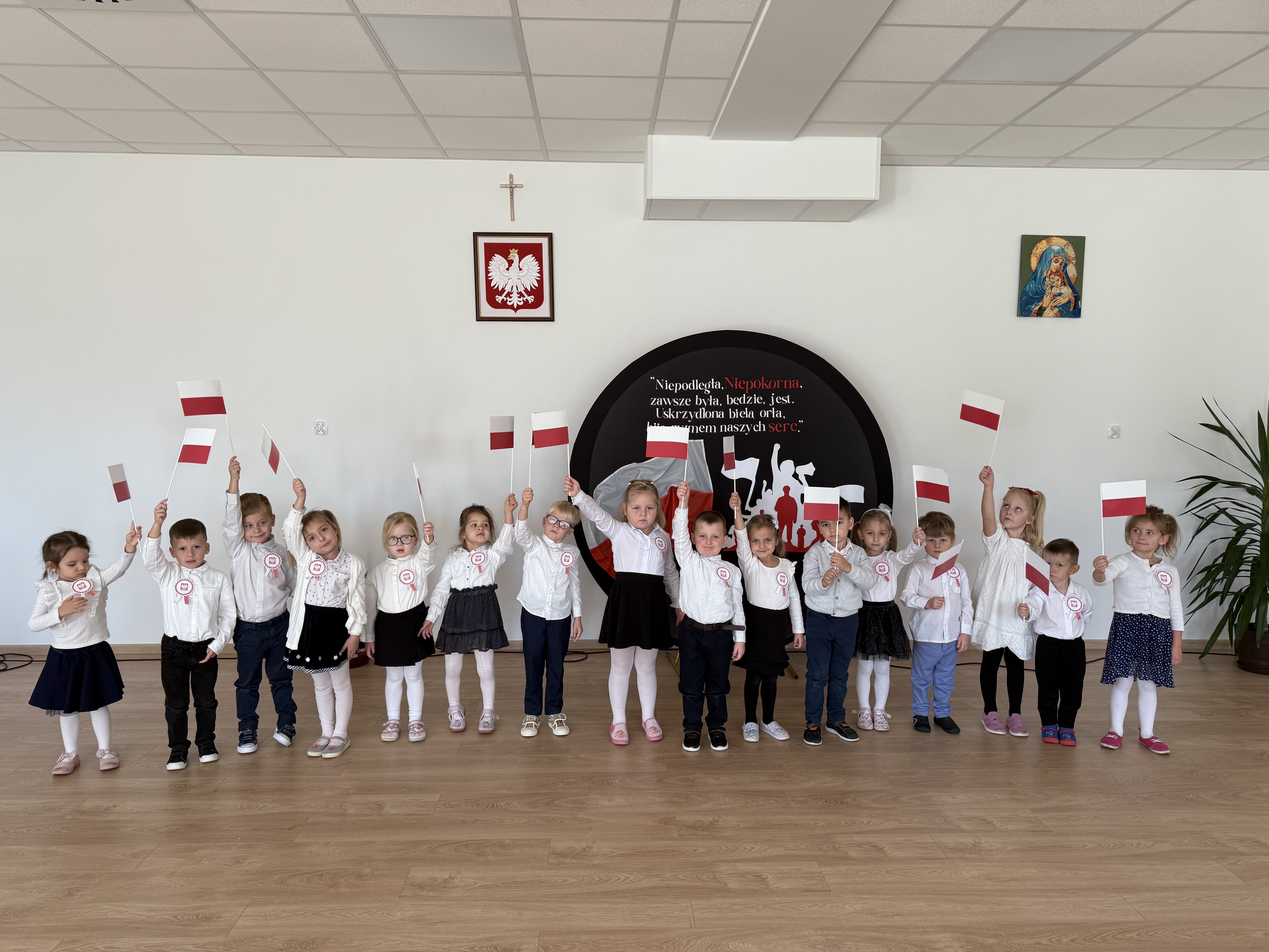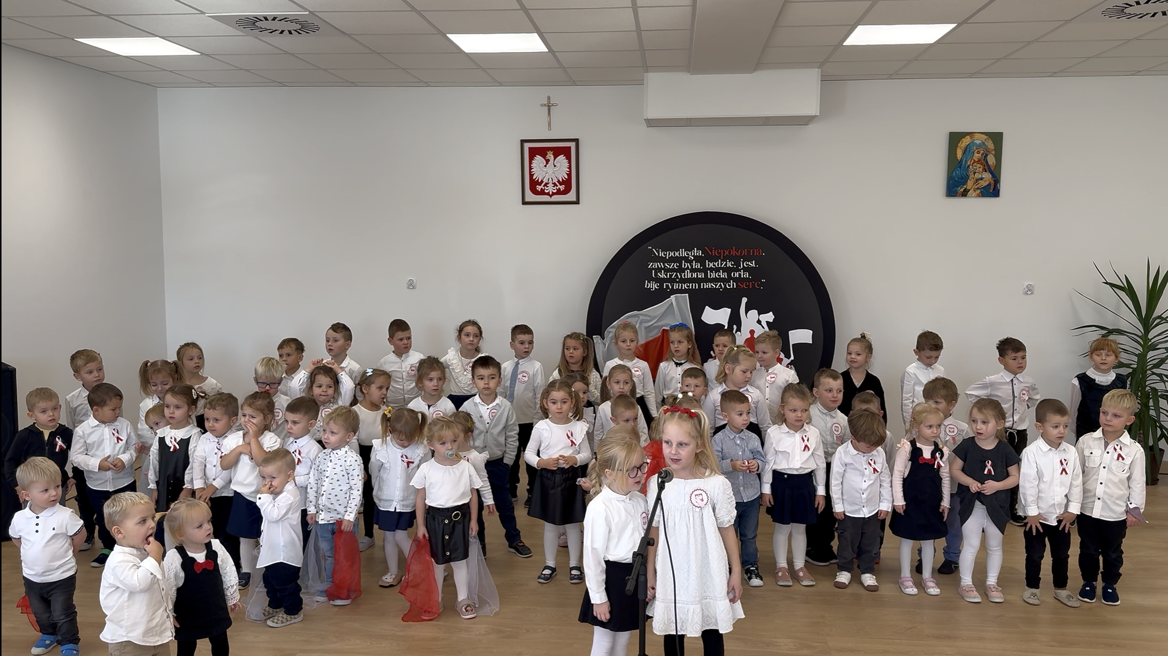 Na zakończenie, dzieci z grupy III wyrecytowały podziękowania, a cała społeczność przedszkolna zwieńczyła występ artystyczny słowami: „Dziękuję Polsko, ojczyzno moja, za to, że jesteś i ja jestem twój, twoja. Kocham cię Polsko, mocno i szczerze, bo jestem Polakiem i w Ciebie wierzę!”