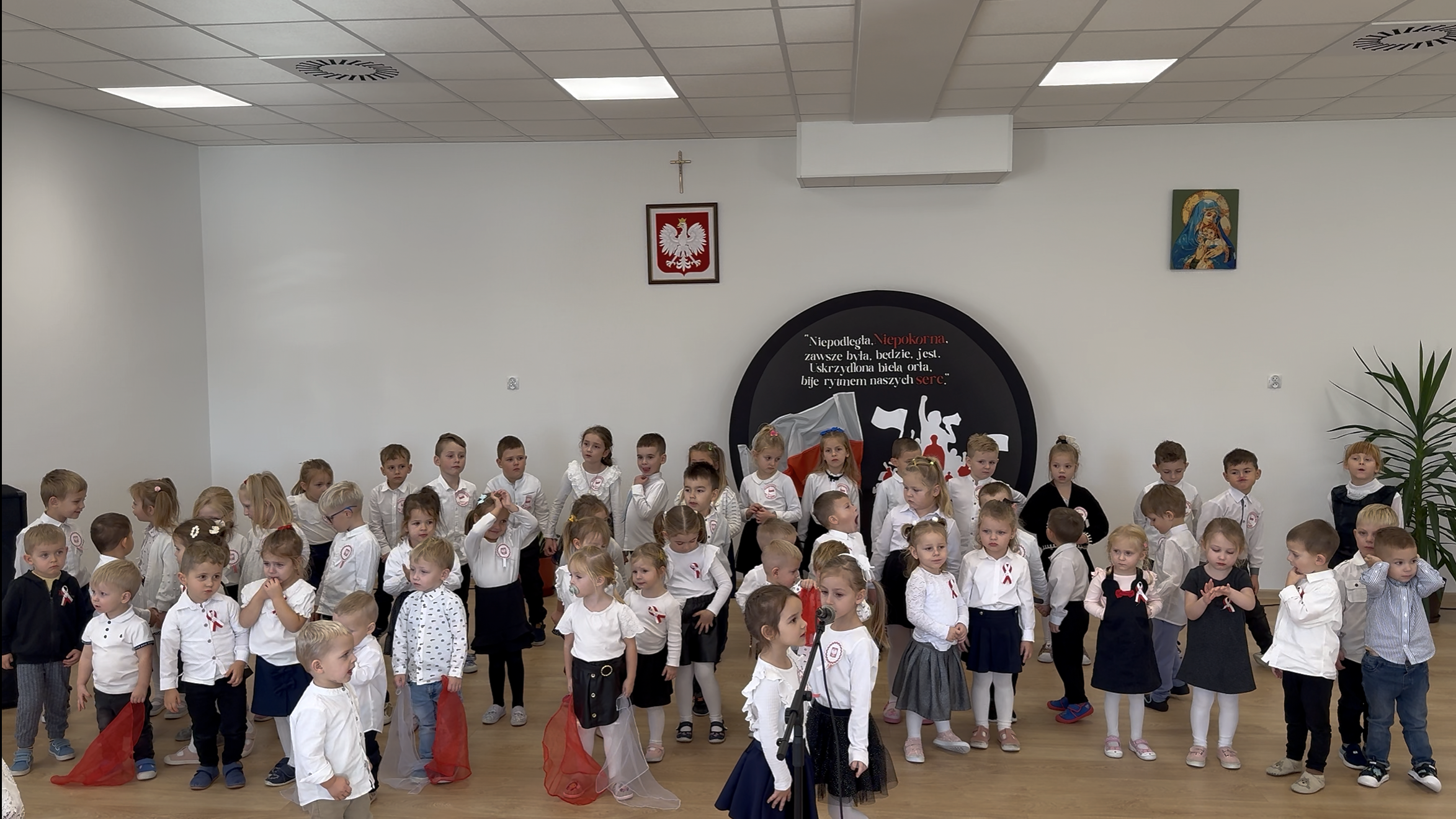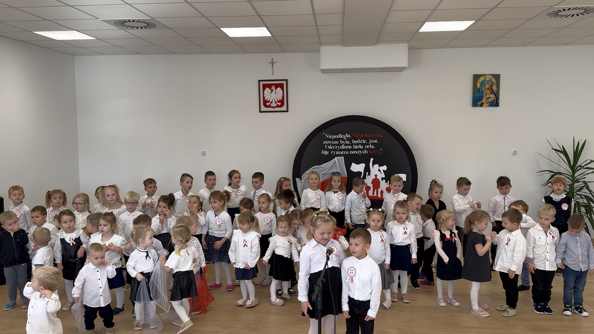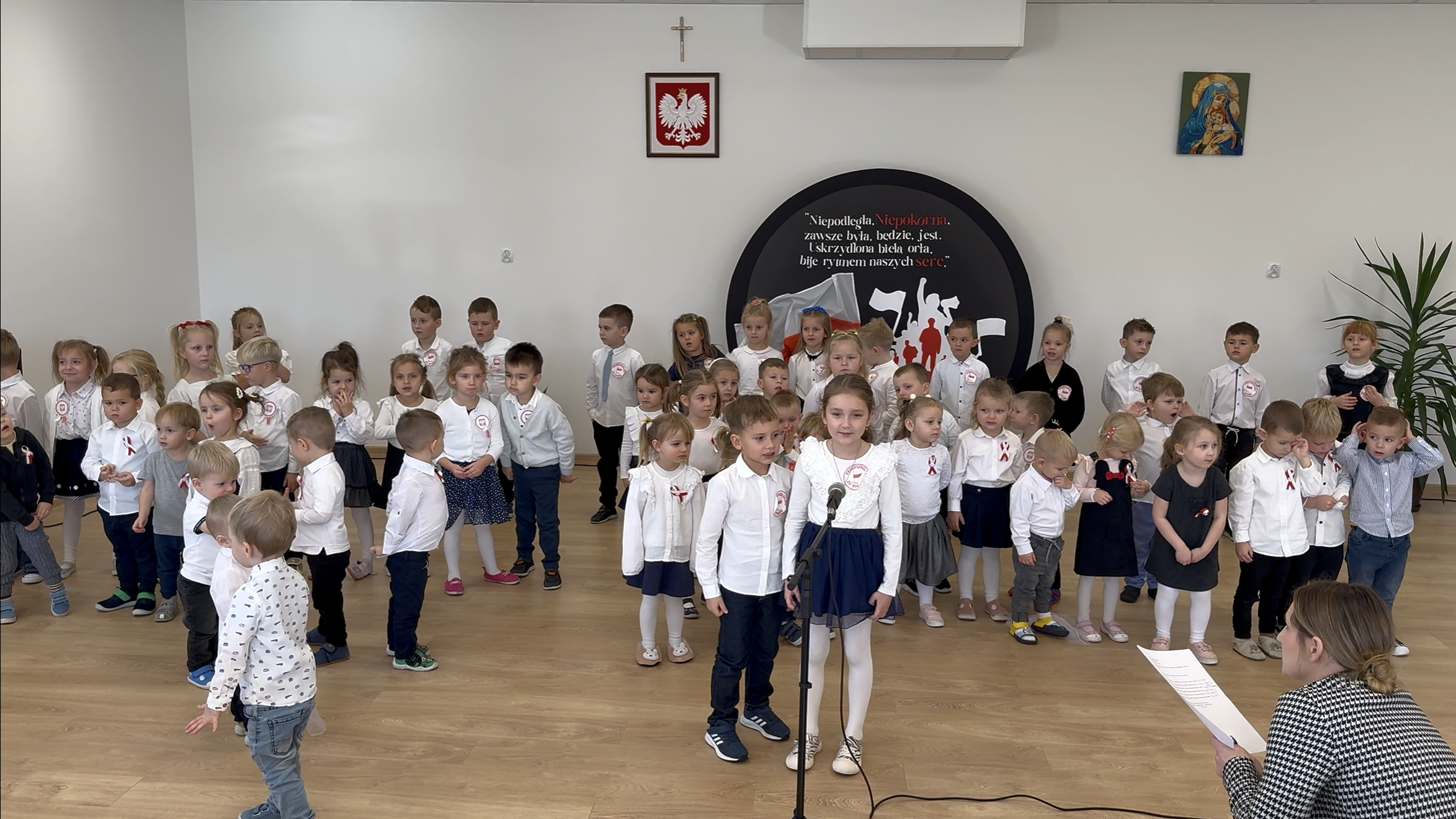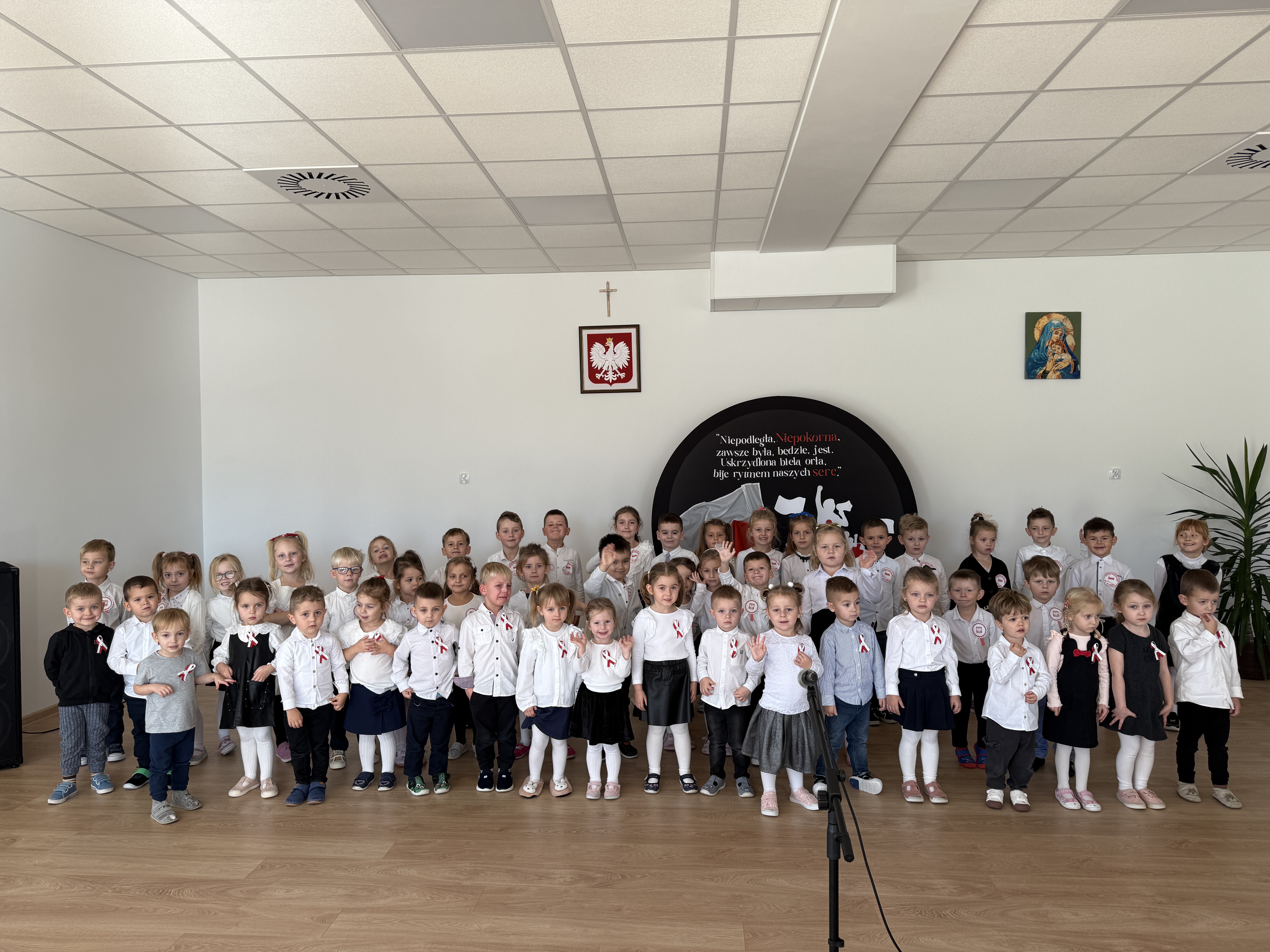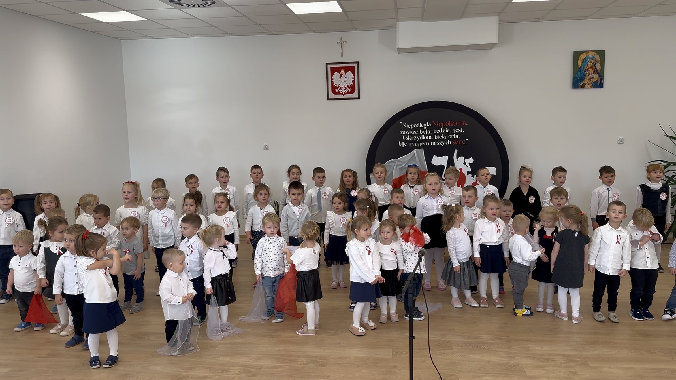 Na zakończenie, dzieci z grupy III wyrecytowały podziękowania, a cała społeczność przedszkolna zwieńczyła występ artystyczny słowami: „Dziękuję Polsko, ojczyzno moja, za to, że jesteś i ja jestem twój, twoja. Kocham cię Polsko, mocno i szczerze, bo jestem Polakiem i w Ciebie wierzę!”