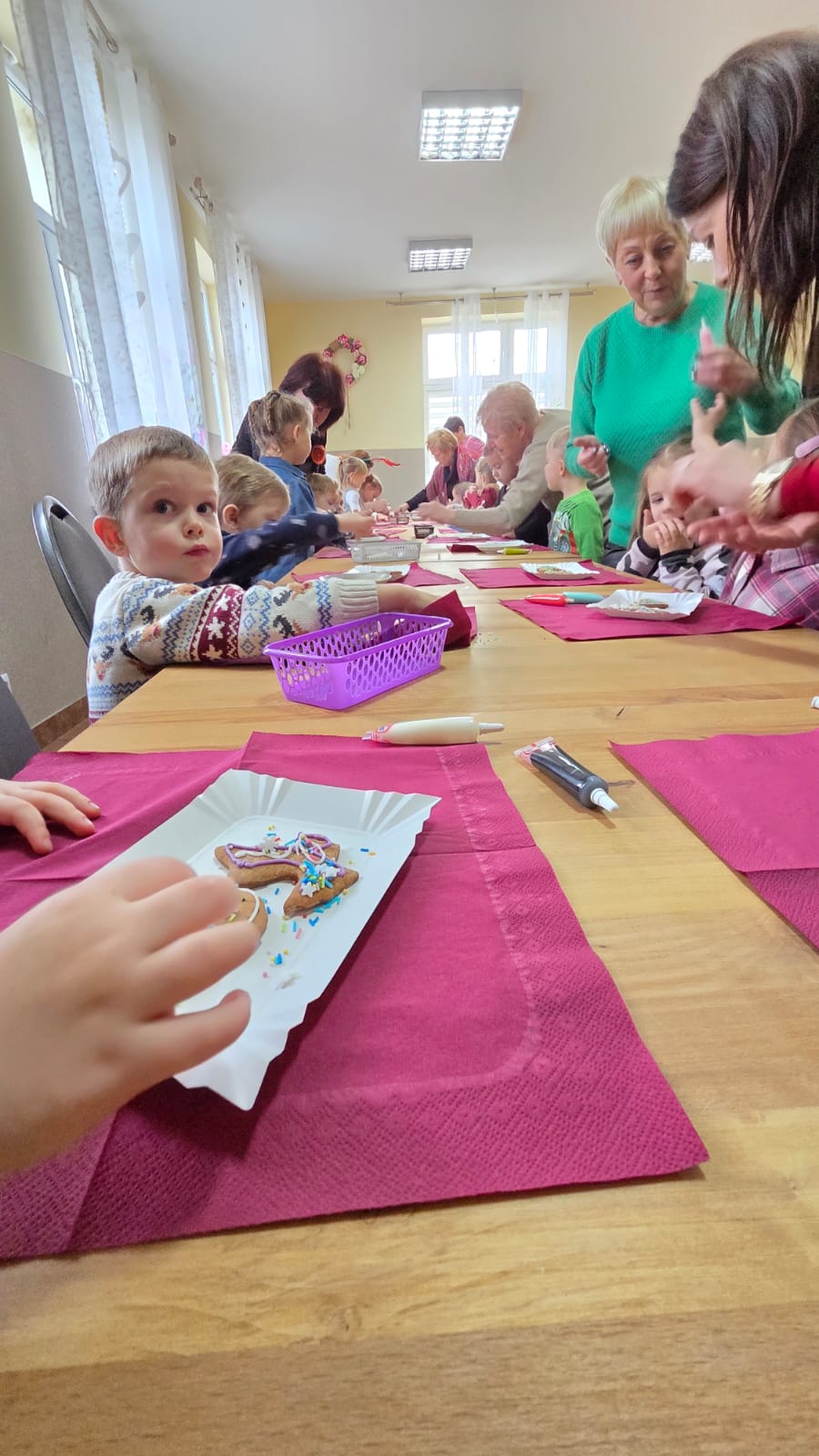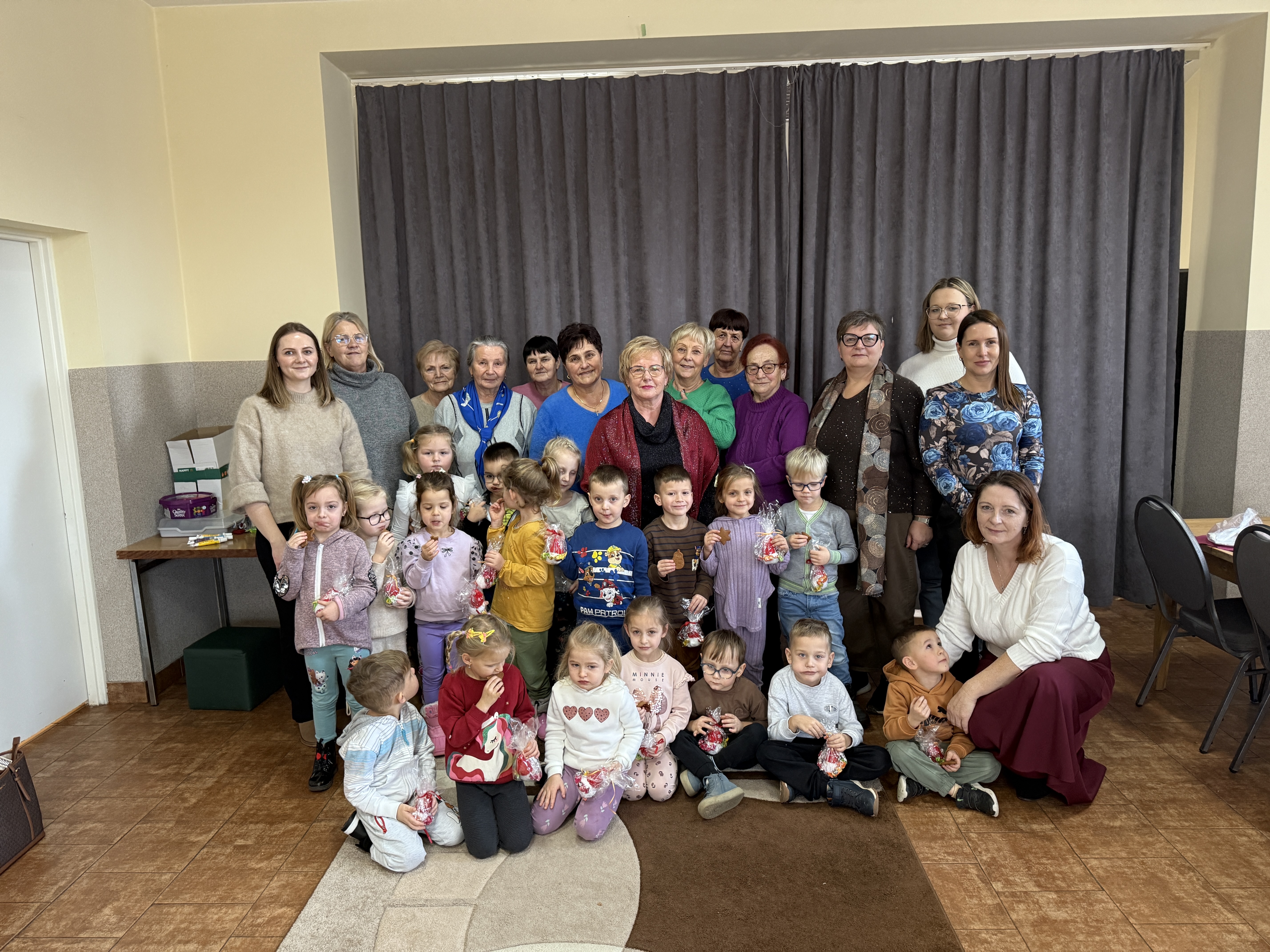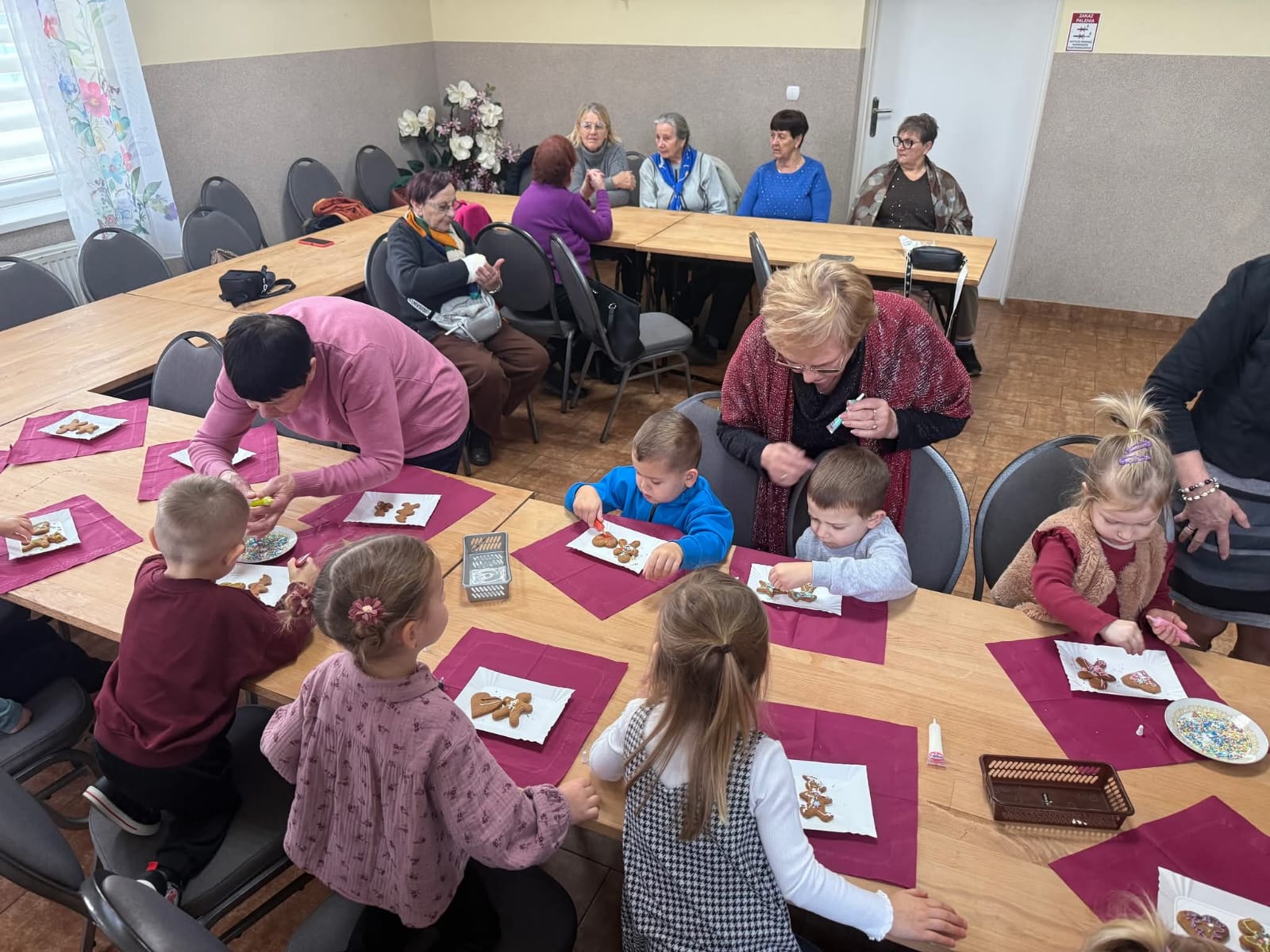 10 grudnia grupa Zuchów oraz Łowców Przygód odwiedziła Dom Kultury we Florynce. Przedszkolaki spotkały się z przedstawicielami Koła Seniora wraz z opiekunem Panią Joanną Witek. Podczas tego wyjątkowego spotkania dzieci wysłuchały treść książki pt: „Opowieść wigilijna” oraz „Miś i świąteczna przygoda”. Dodatkowo dzieci oglądały świąteczne książki oraz wzięły udział w zabawie ruchowej obrazującej pieczenie pierniczków. Najważniejszym punktem spotkania było wspólne dekorowanie pierniczków, które przyniosło dzieciom najwięcej radości. Na zakończenie dzieci otrzymały od Seniorów własnoręcznie przez nich wykonany prezent, w postaci krasnala zrobionego z włóczki.