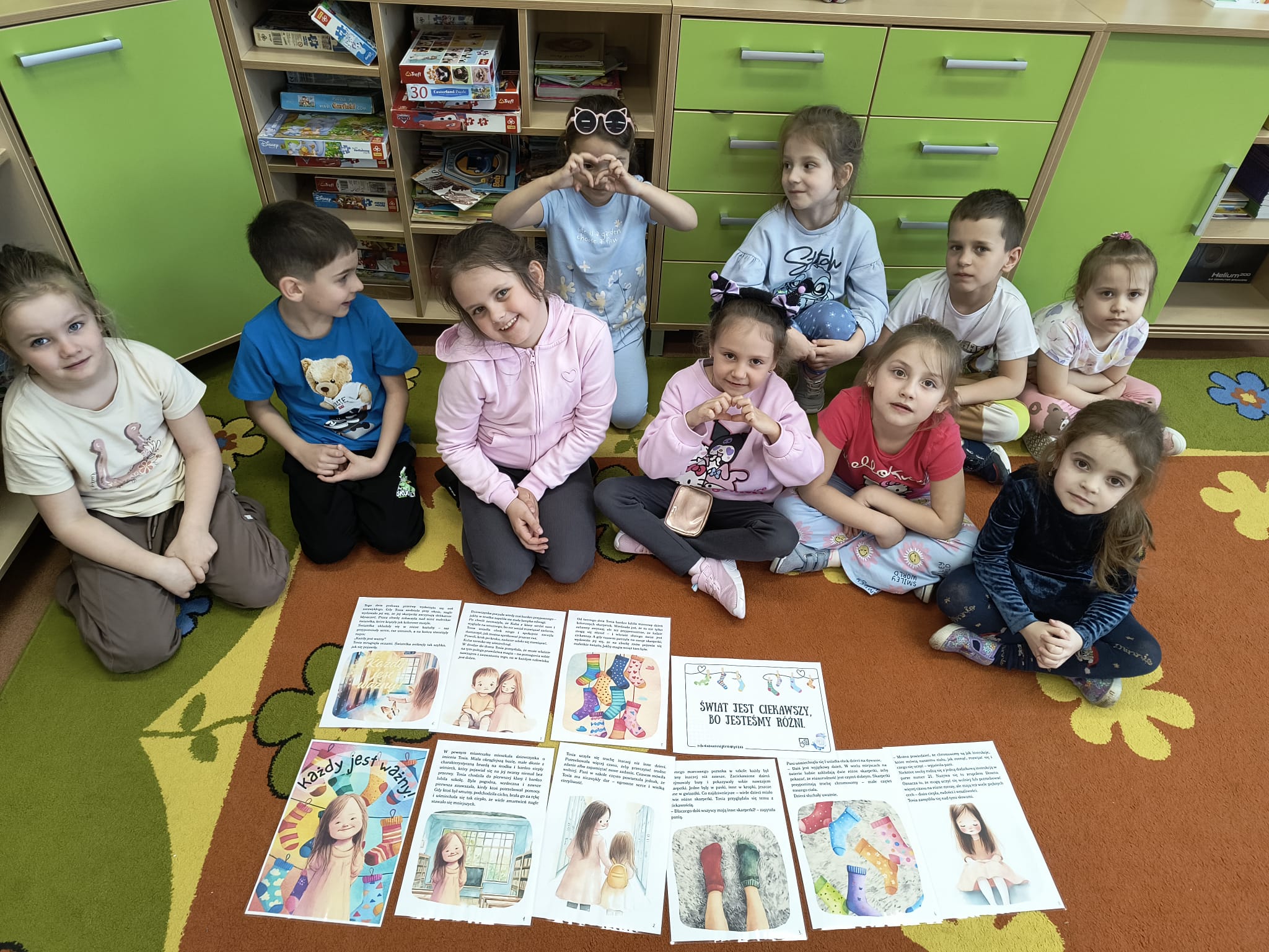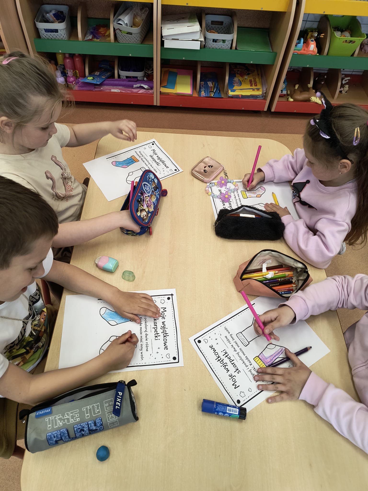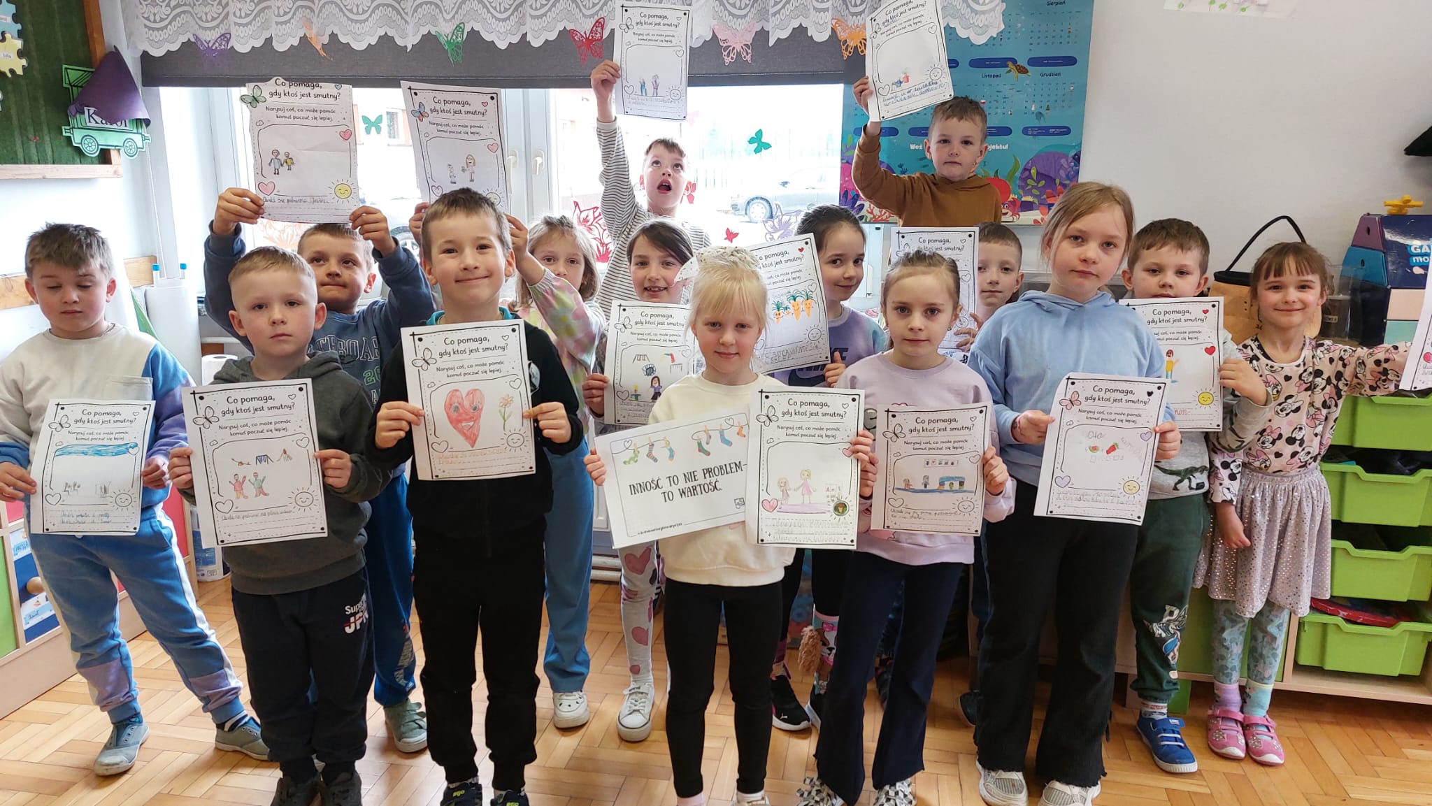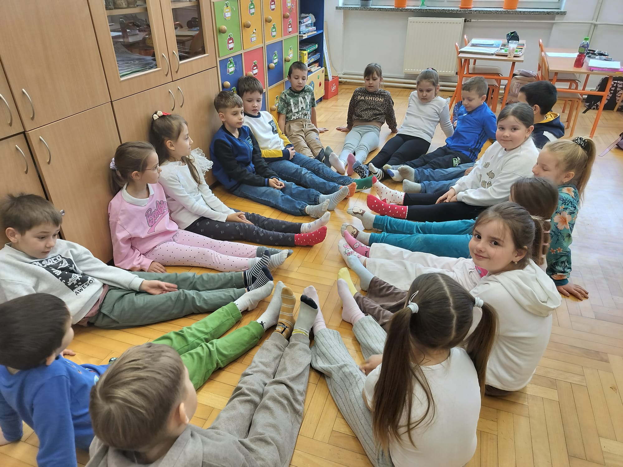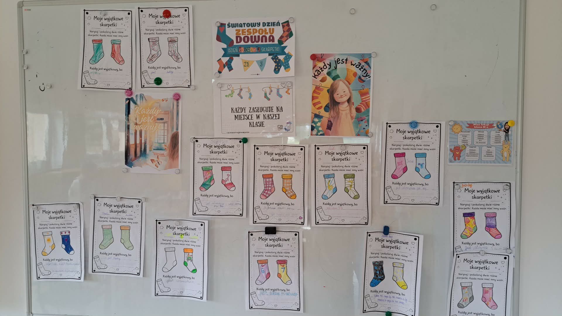 Podczas zajęć uczniowie oglądali filmy edukacyjne oraz uczestniczyli w rozmowach na temat zespołu Downa i cech charakterystycznych dzieci nim dotkniętych. Wspólnie zastanawiali się, co oznacza bycie wyjątkowym oraz jak możemy wspierać innych – szczególnie w chwilach smutku. Dzieci brały również udział w zajęciach plastycznych, podczas których kolorowały dwie różne skarpetki, symbolizujące różnorodność i akceptację. Każda grupa wysłuchała także historii Tosi – dziewczynki z zespołem Downa, która pomogła uczniom lepiej zrozumieć codzienne życie i potrzeby osób z tą wadą genetyczną.